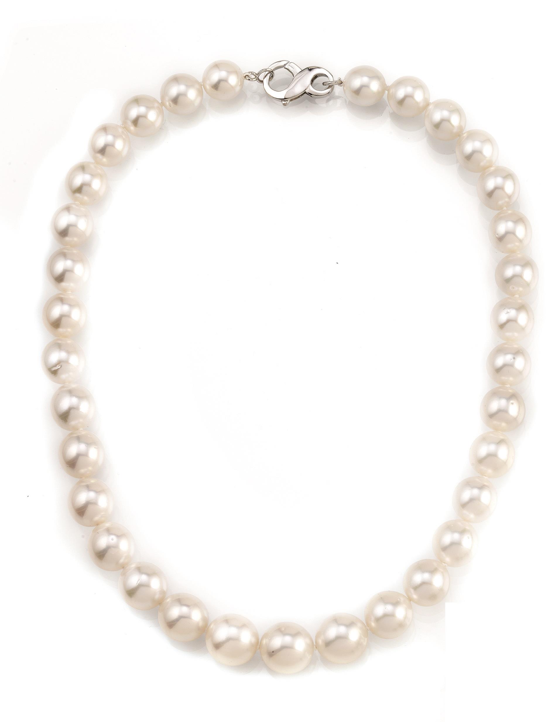 realizzata ad una fila di trentatre perle australiane poste in gradazione, diametro 12-15 mm, fermatura in oro bianco a gancio, punzone 750, 116 g