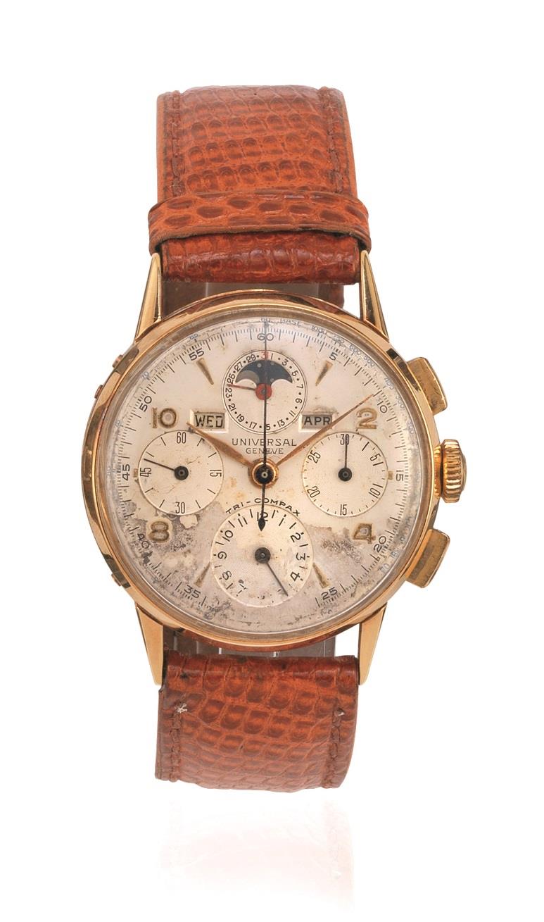 OROLOGIO DA POLSO CON CRONOGRAFO, CALENDARIO COMPLETO E FASI LUNARI, UNIVERSAL GENEVE TRI-COMPAX, REF. 12551, SERIALE N. 1’043’740, ANNI 1943-’45 CIRCA, IN ORO GIALLO