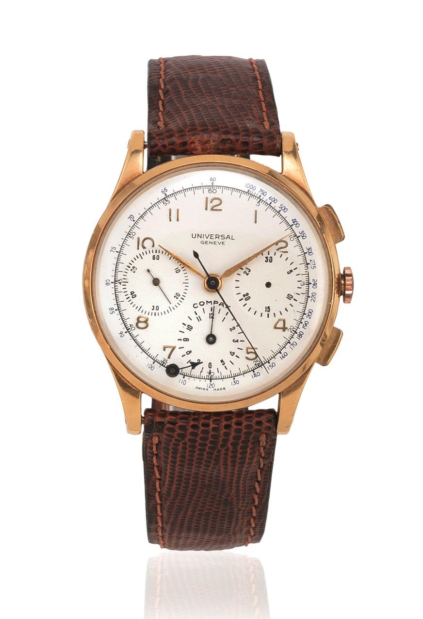OROLOGIO DA POLSO CON CRONOGRAFO UNIVERSAL GENEVE COMPAX, REF. 124-104, SERIALE N. 1’361'765, ANNI 1946-‘49, IN ORO GIALLO
