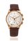 Cassa bombata con fondello a scatto in oro lucido, anse curve, pulsanti cronografici rettangolari. Quadrante bianco con numeri arabi oro applicati, scala tachimetrica periferica blu, tre quadranti ausiliari ad ore 3, 6 e 9 rispettivamente con registri dei 30 minuti e delle 12 ore e secondi continui, lancette a foglia oro, lancetta dei secondi cronografici nera al centro. Movimento a carica manuale calibro 287. Cinturino in pelle con fibbia ad ardiglione in metallo dorato non pertinente, cassa, quadrante e movimento firmati