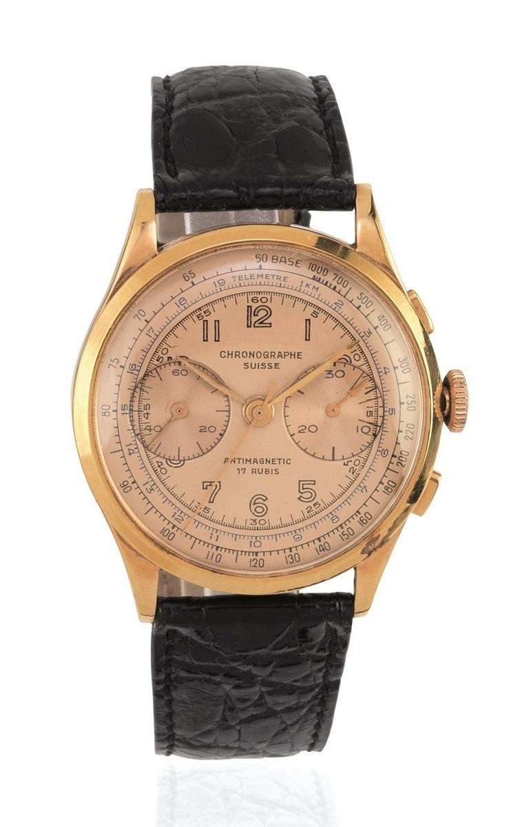 OROLOGIO DA POLSO CON CRONOGRAFO, ANONIMO SVIZZERO, CRONOGRAPHE SUISSE ANTIMAGNETIC 17 RUBIS, ANNI ’50, IN ORO ROSA
