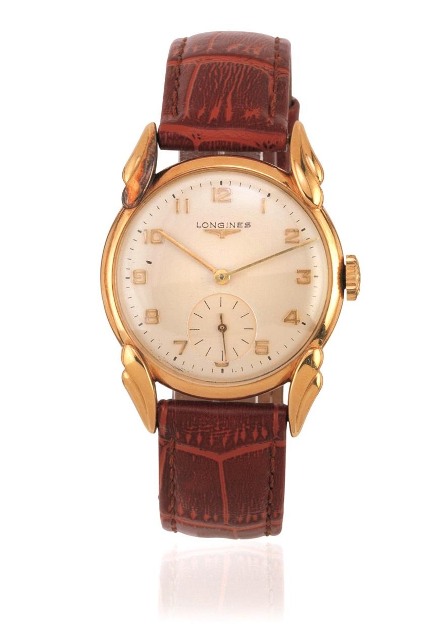 Cassa in due corpi in oro lucido e satinato, fondello a scatto, anse a doppia goccia. Quadrante argentè con numeri arabi oro applicati, lancette ad ago, secondi a ore 6. Movimento a carica manuale calibro 1268Z. Cinturino in pelle con fibbia ad ardiglione in oro Longines, cassa, quadrante e movimento firmati