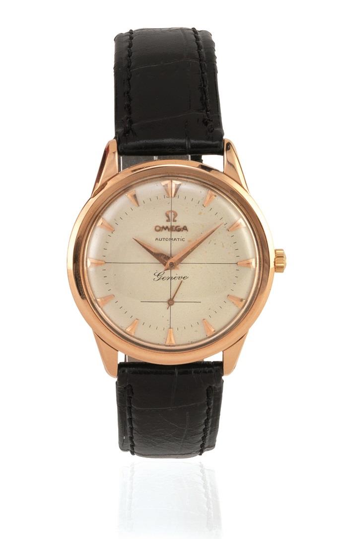 Cassa in due corpi in oro lucido e satinato, fondello a scatto, vetro plastica. Quadrante argentè con indici a punta di freccia oro applicati, lancette Dauphine oro, secondi a ore 6. Movimento a carica automatica calibro 491. Cinturino in pelle con fibbia ad ardiglione placcata oro Omega, cassa, quadrante e movimento firmati