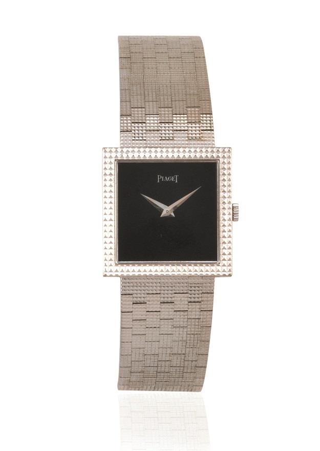 Cassa carrè in due corpi con fondello a scatto, lunetta guillochè. Quadrante in onice con lancette Dauphine. Movimento a carica manuale calibro 9P. Bracciale a maglie realizzato come un nastro cesellato ad effetto tessuto, chiusura deployante analogamente lavorata Piaget, cassa, quadrante e movimento firmati