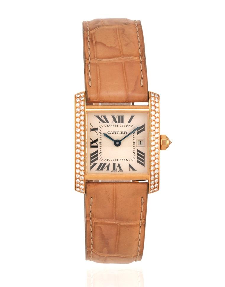 Cassa carrè in due corpi, fondello chiuso da quattro viti, parti laterali della lunetta decorate da due linee di diamanti, corona di carica decorata da un diamante, vetro zaffiro. Quadrante avorio con numeri romani radiali, datario a ore 3, lancette blu a spada. Movimento al quarzo. Cinturino originale in pelle con chiusura deployante in oro giallo Cartier, cassa, quadrante e movimento firmati
