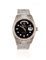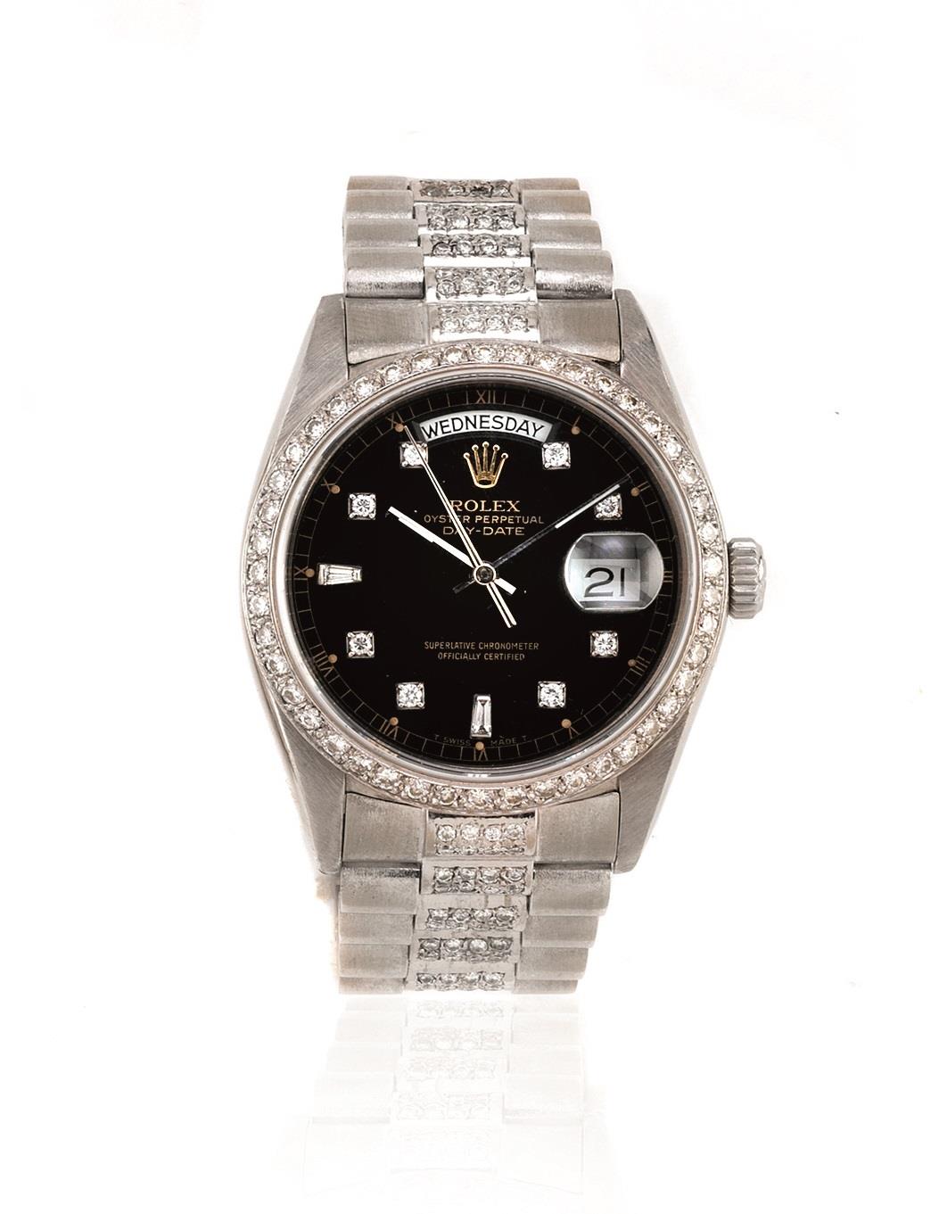 Cassa in tre corpi in oro lucido e satinato, fondello e corona a vite, lunetta decorata da una linea di brillanti, vetro zaffiro. Quadrante nero con indici applicati in brillanti e baguettes, lancette a bastone con inserto luminescente, secondi al centro, datario a ore 3. Movimento a carica automatica calibro 3035. Bracciale President in oro bianco con maglie centrali in pavè di brillanti, chiusura deployante, cassa, quadrante e movimento firmati