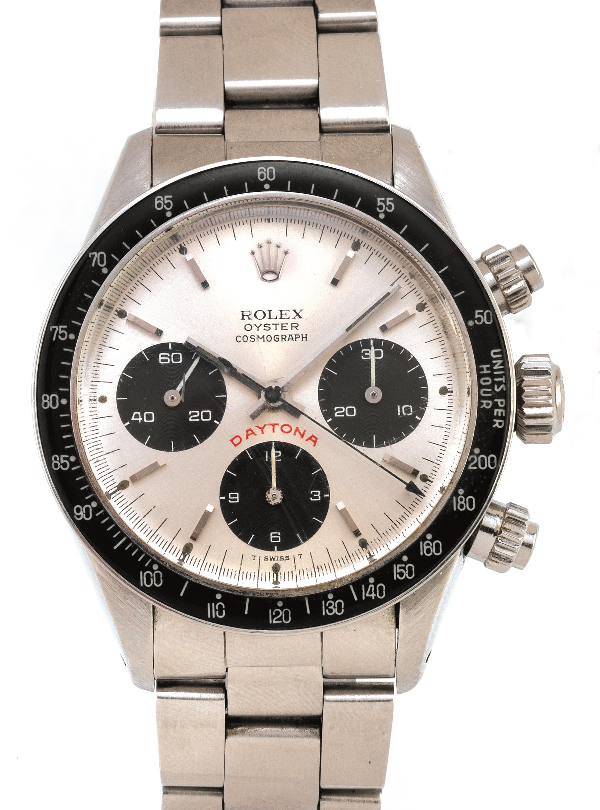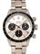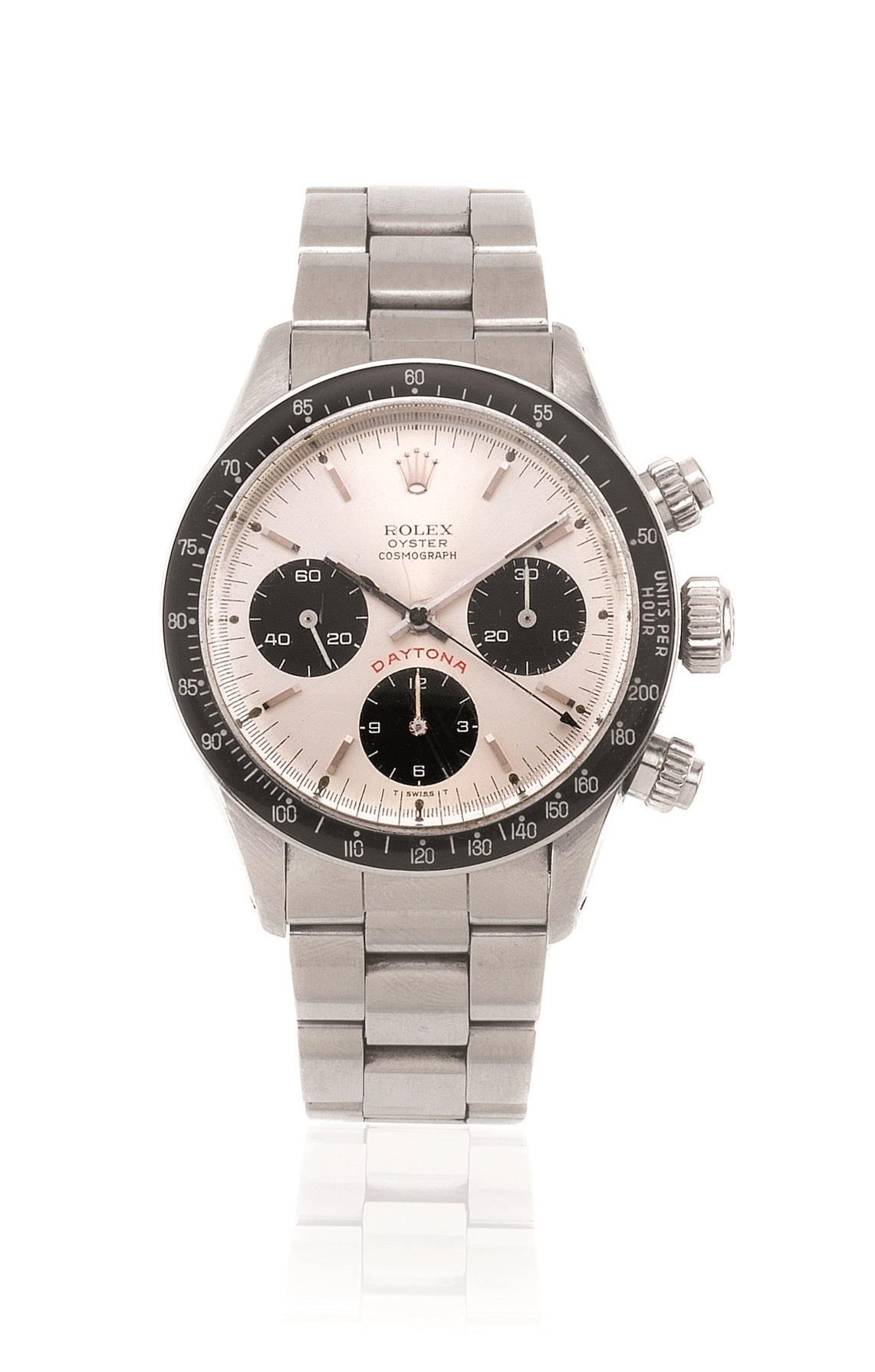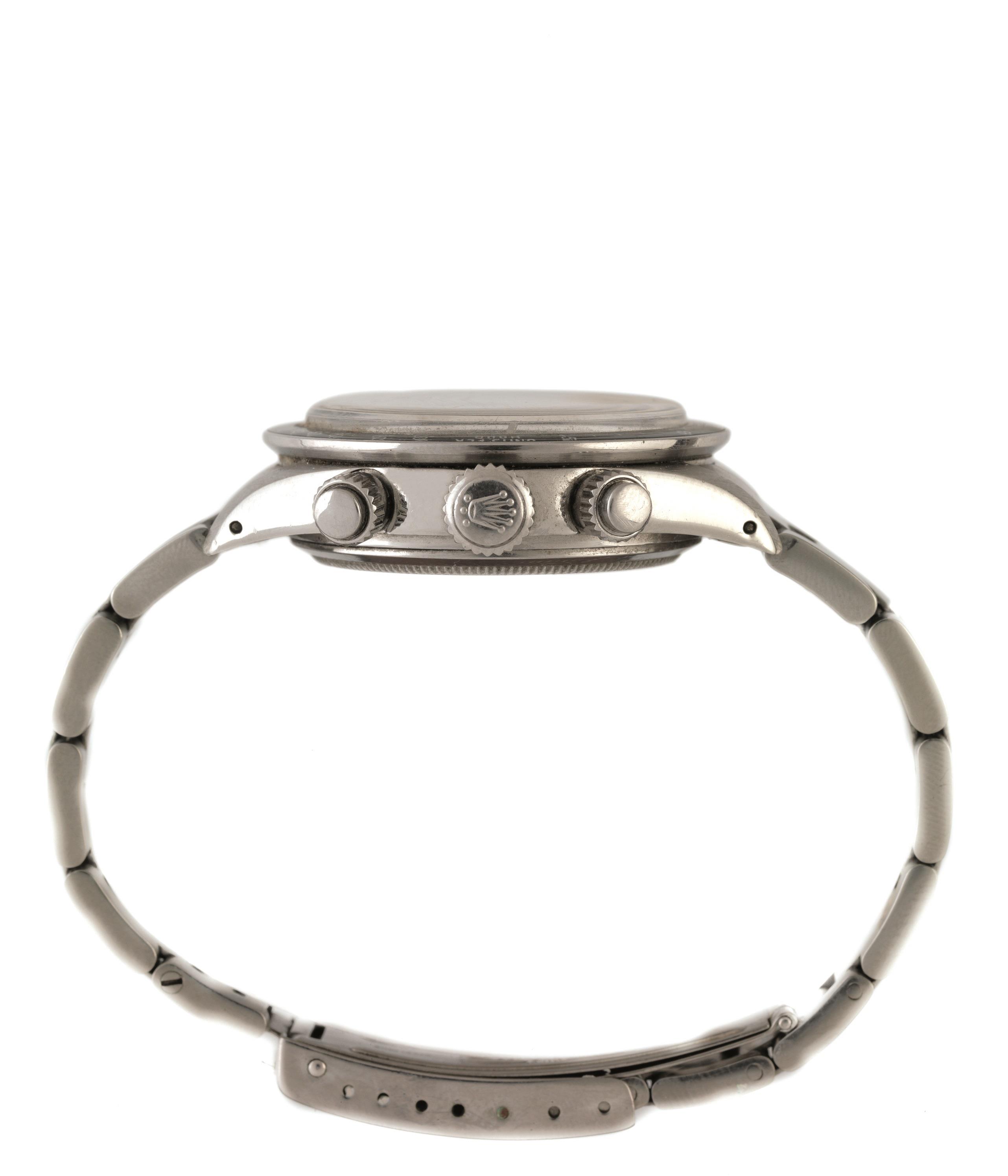 Cassa in tre corpi in acciaio lucido e satinato, fondello, corona e pulsanti cronografici a vite, lunetta nera con scala tachimetrica a 200 unità per ora, vetro plastica. Quadrante argentè con indici applicati e lancette a bastone con inserto in materiale luminescente, lancetta dei secondi cronografici al centro nera, tre quadranti ausiliari neri ad ore 3,6, e 9 rispettivamente con registro dei 30 minuti, delle 12 ore e secondi continui. Movimento a carica manuale calibro 727. Bracciale a maglie Oyster in acciaio, chiusura deployante, cassa, quadrante e movimento firmati