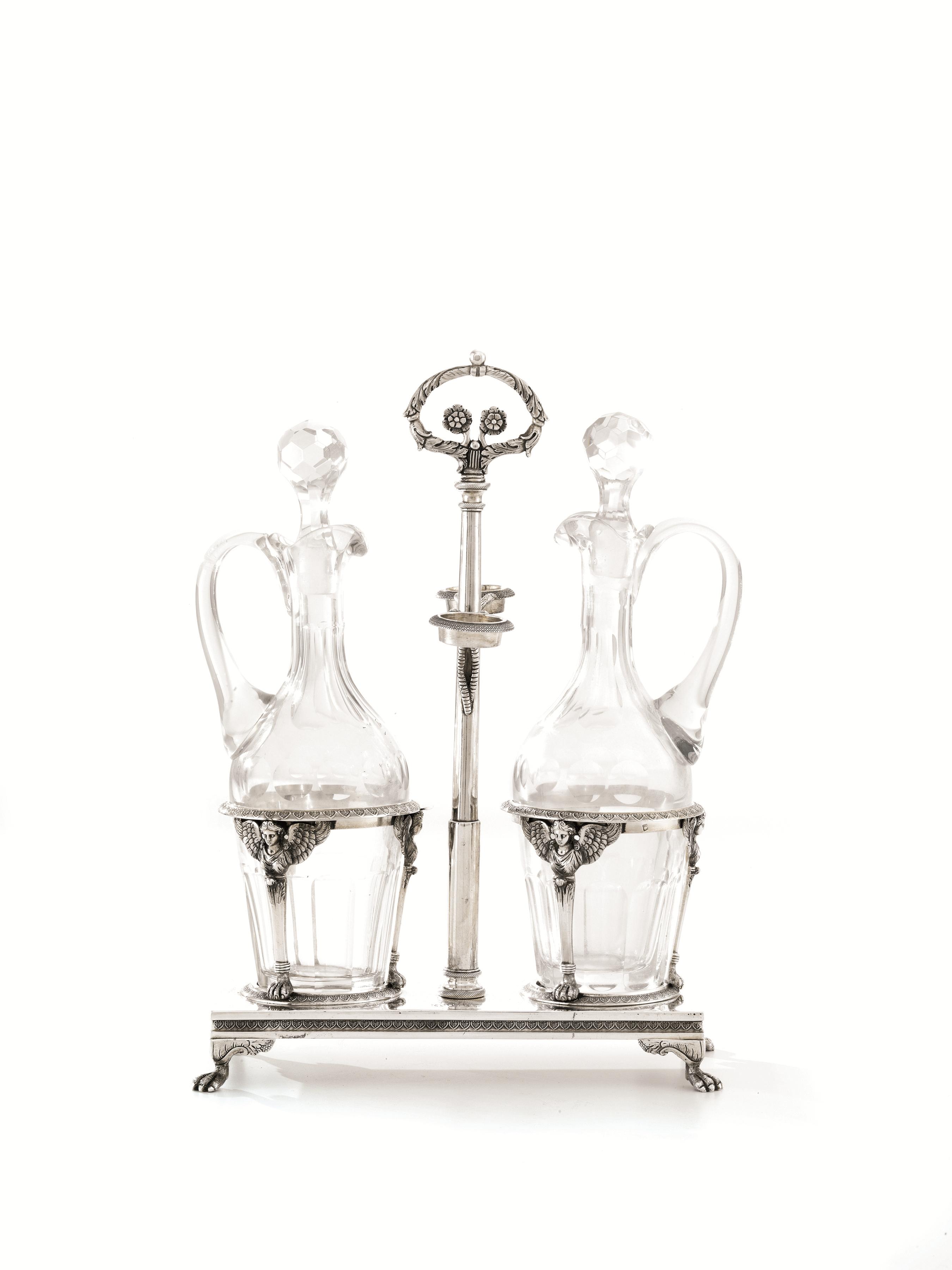 in argento, base rettangolare poggiante su quattro piedini realizzati ad artigli, porta ampolle con bordi decorati da palmette, fusto centrale a colonna con porta tappi, presa a volute vegetali contrapposte, alt. cm 31, g 790