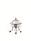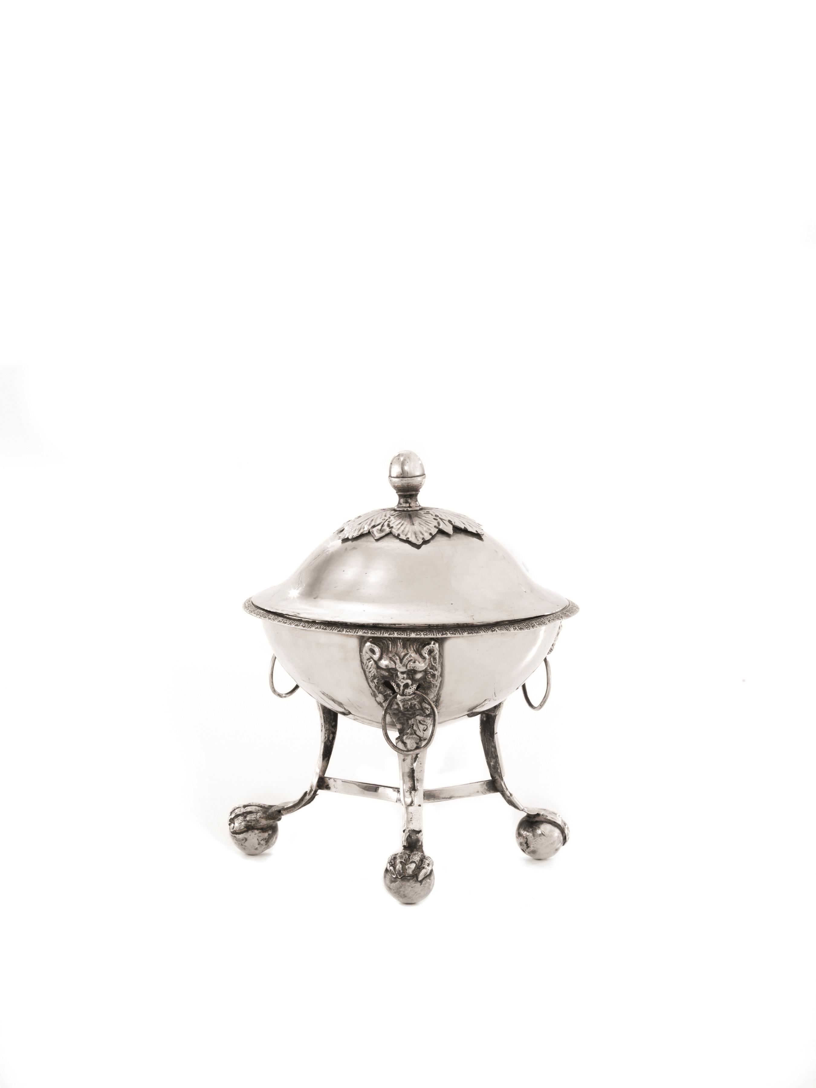 in argento, corpo semisferico poggiante su tre piedini terminanti a zampa ferina su sfera, due anse ad anello trattenuto tra le fauci di un leone, coperchio con presa piriforme, alt. cm 14, g 205