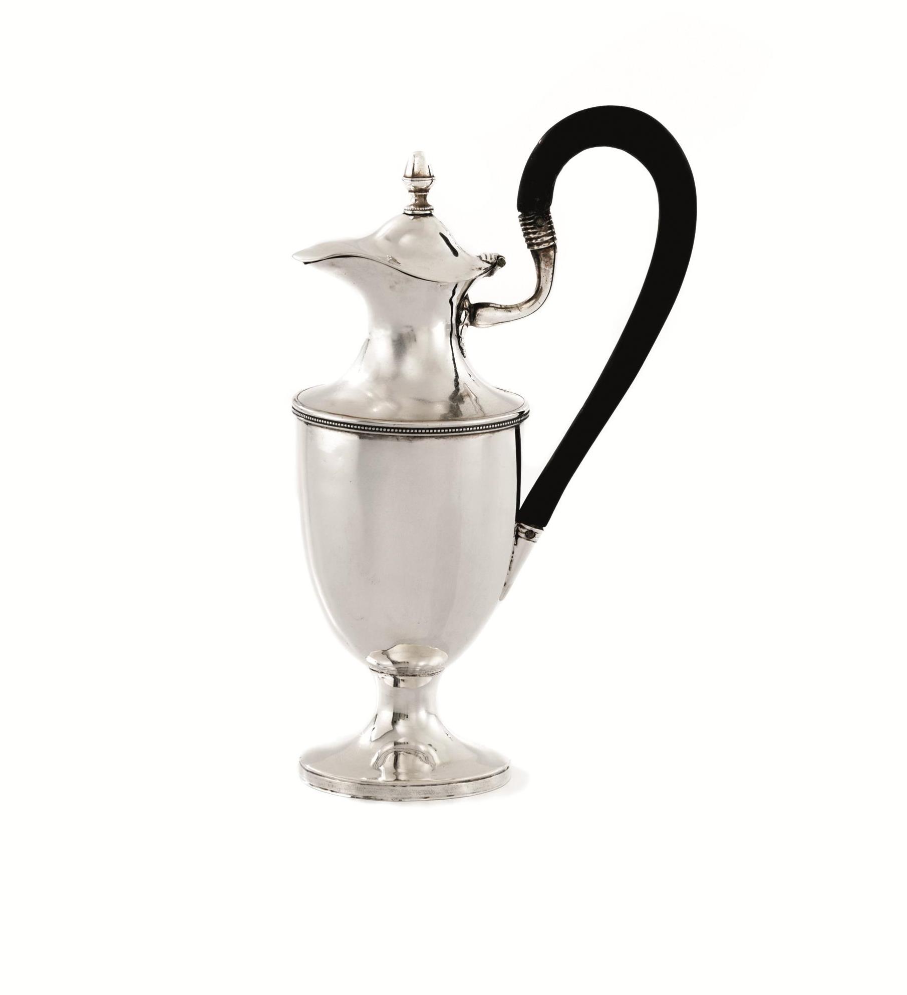 corpo piriforme su piede circolare, presa in legno a voluta, finale del coperchio a pigna, alt. cm 19,5, g 260