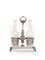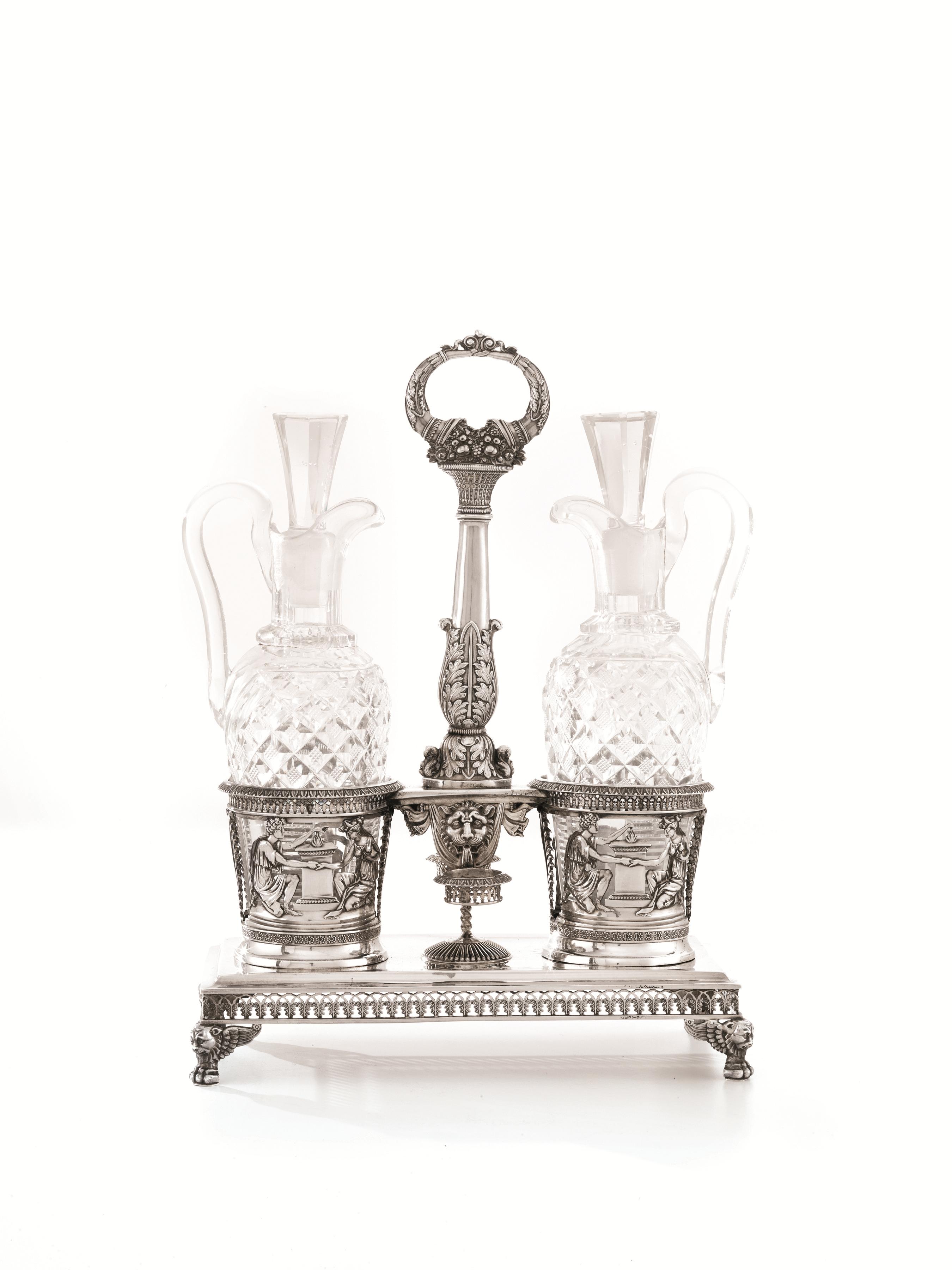 base rettangolare con bordo traforato, porta ampolle con sostegi realizzati da figure in abiti classici, fusto con decoro a volute, presa a cornucopie contrapposte, alt. cm 33, g 600