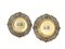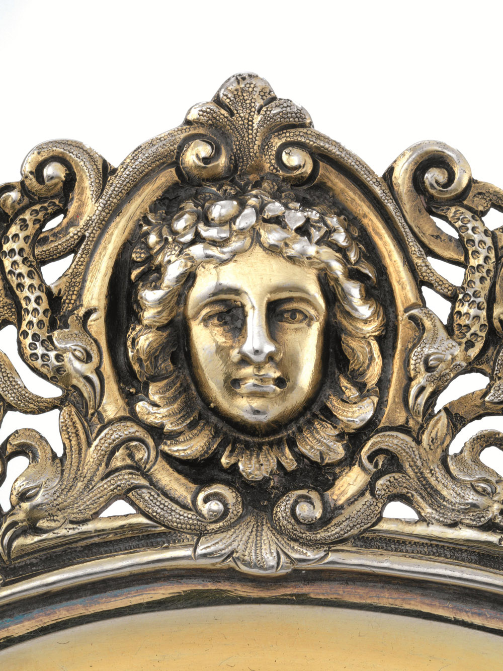 in vermeil, cavetto inciso con stemmi e cartigli iscritti Premium Virtutis Honor Higher, tese riccamente traforate, sbalzate e cesellate con volute vegetali, frutti, figure allegoriche e mascheroni entro riserve, diam. cm 24, complessivi g 950 (2)