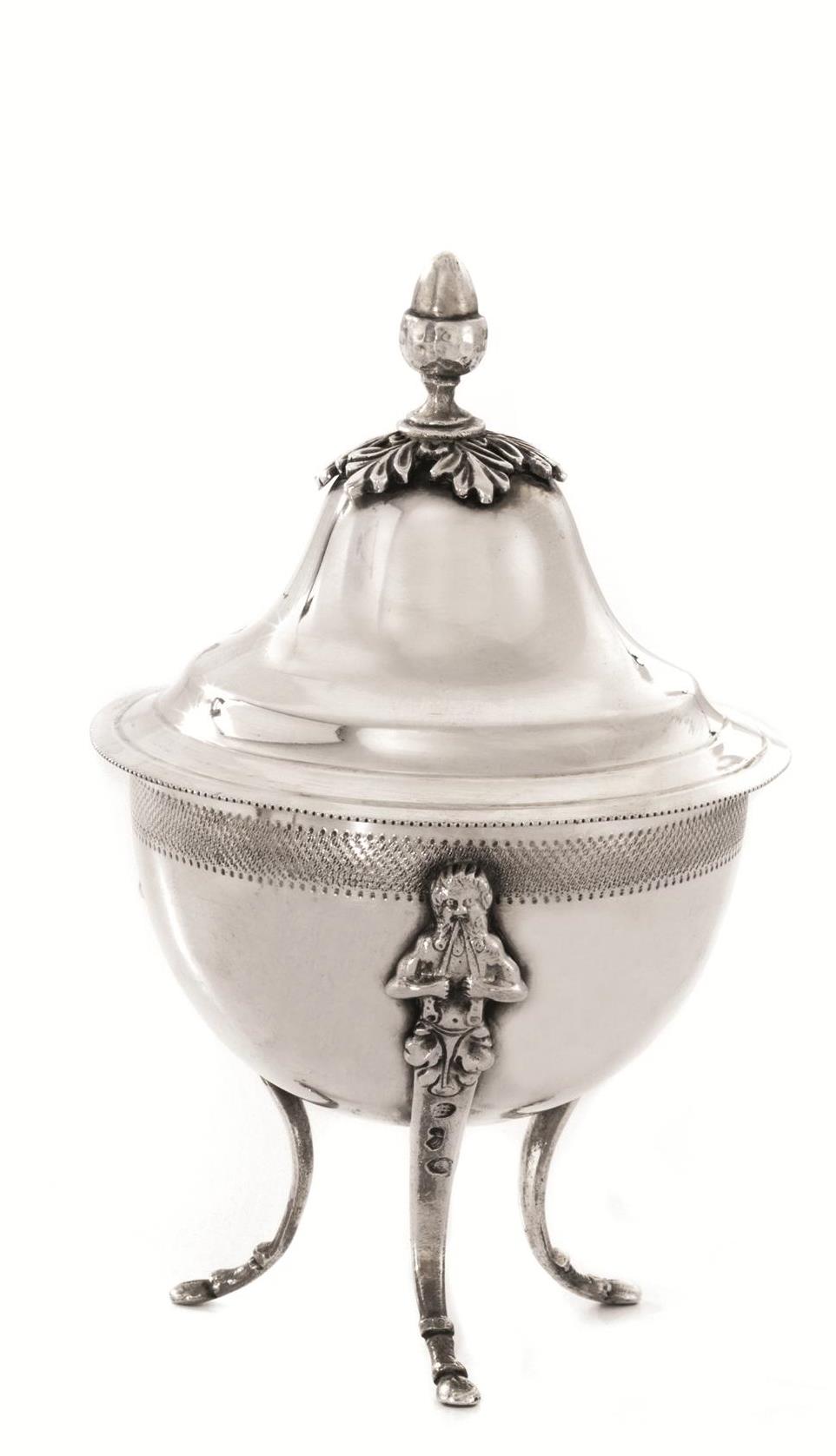 ZUCCHERIERA, SECOLO XIX in argento poggiante su tre piedini terminanti...