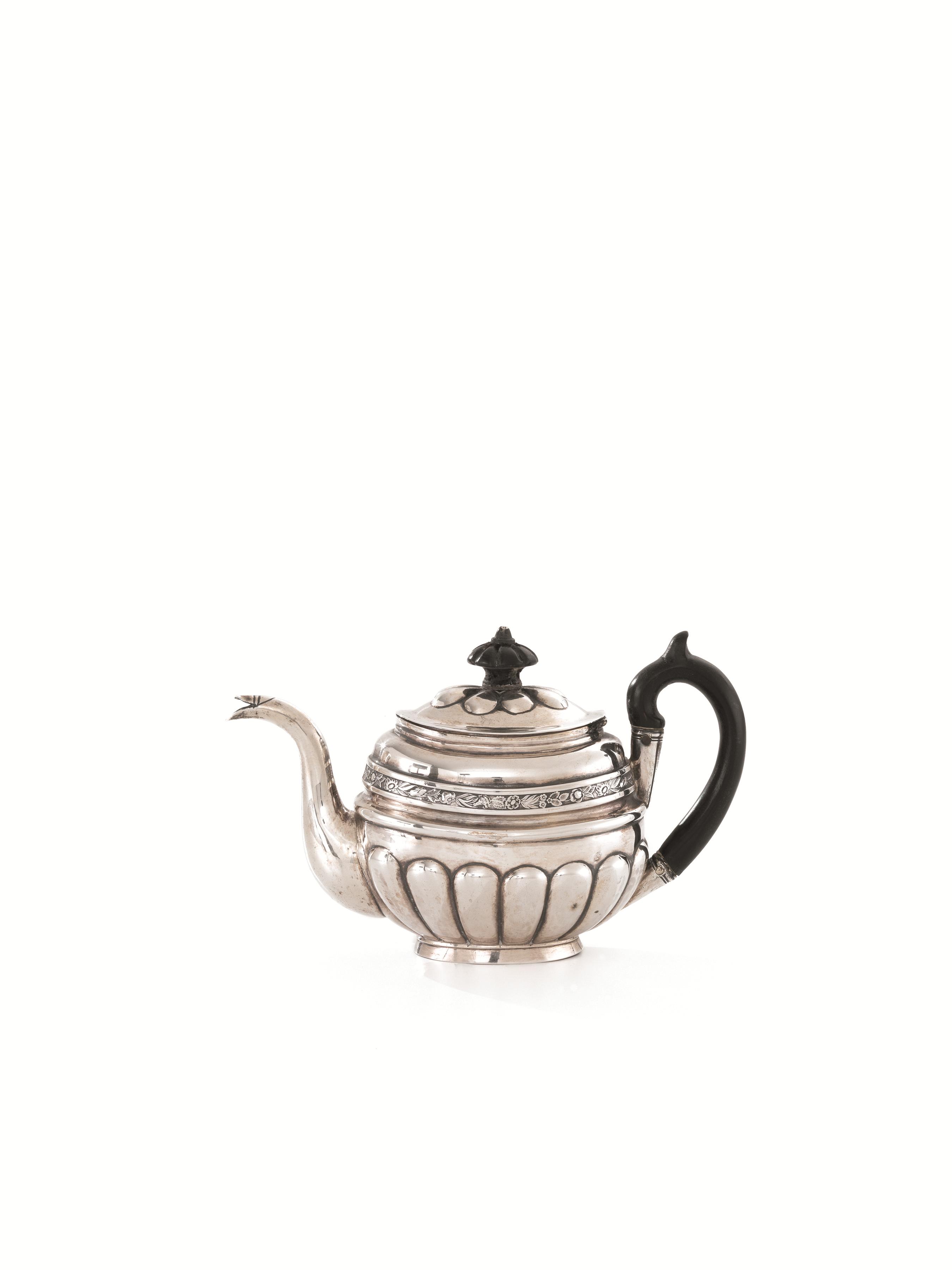 TEIERA, MOSCA, 1826 in argento sbalzato a baccellature, ansa in legno...