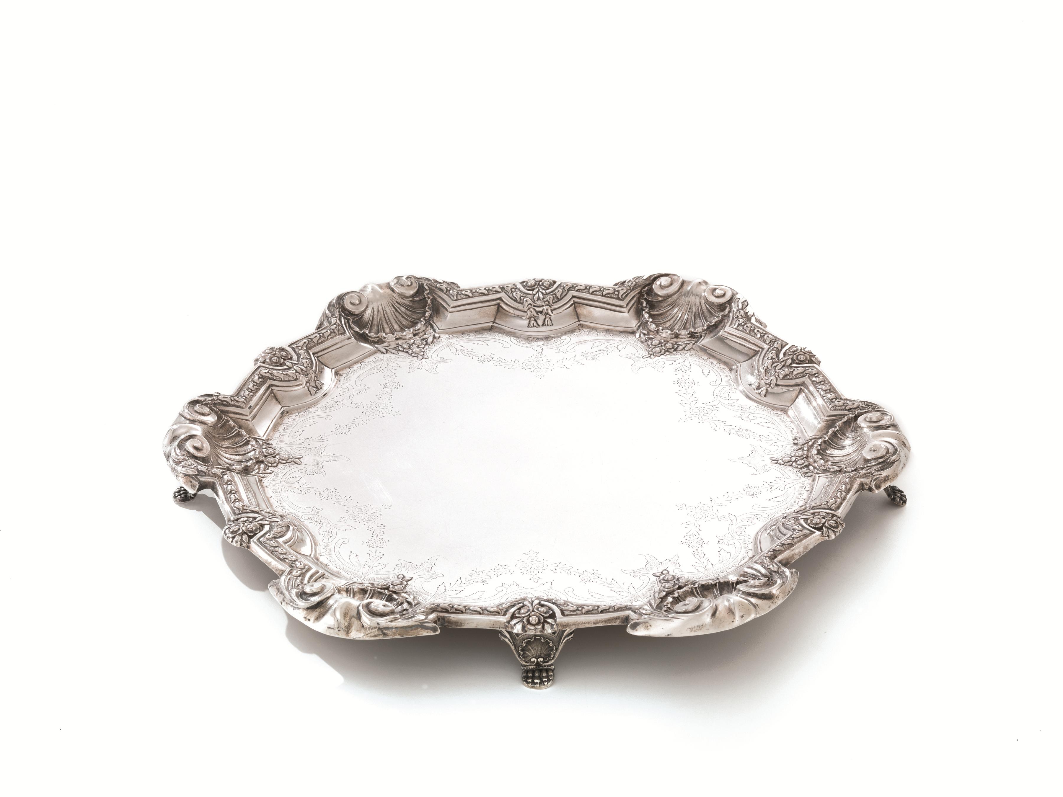 in argento, di forma circolare sagomata con tesa decorata da festoni di fiori e motivi a conchiglia, quattro piedini terminanti a zampa ferina, diam. cm 42, g 1160