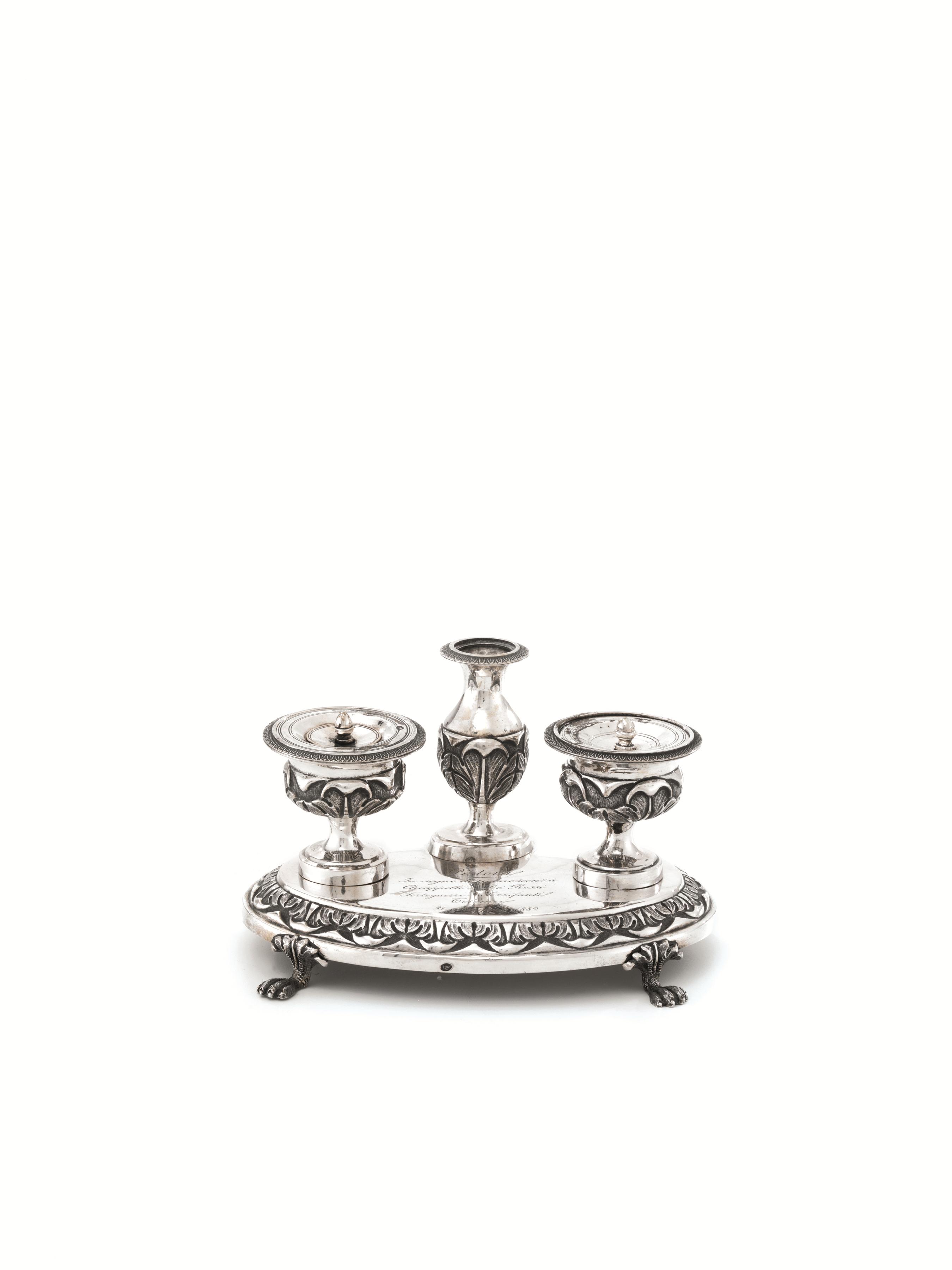 in argento, base ovale con profilo decorato da foglie su cui poggiano due boccette ed un porta pennino, quattro piedini terminanti ad artigli, dedica incisa con data 21 maggio 1882, cm 20x13,5, g 460