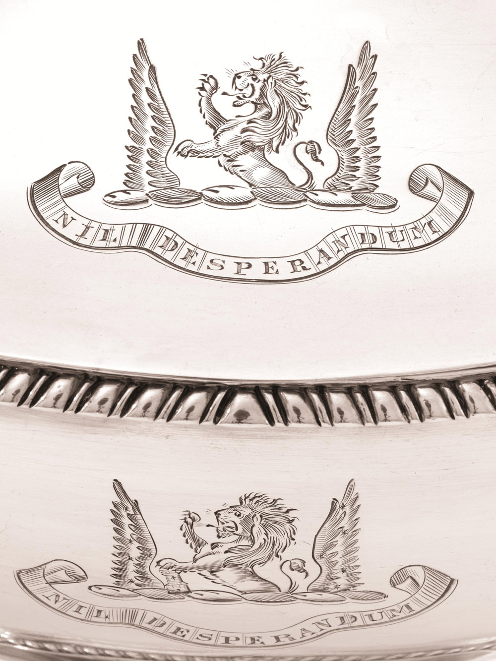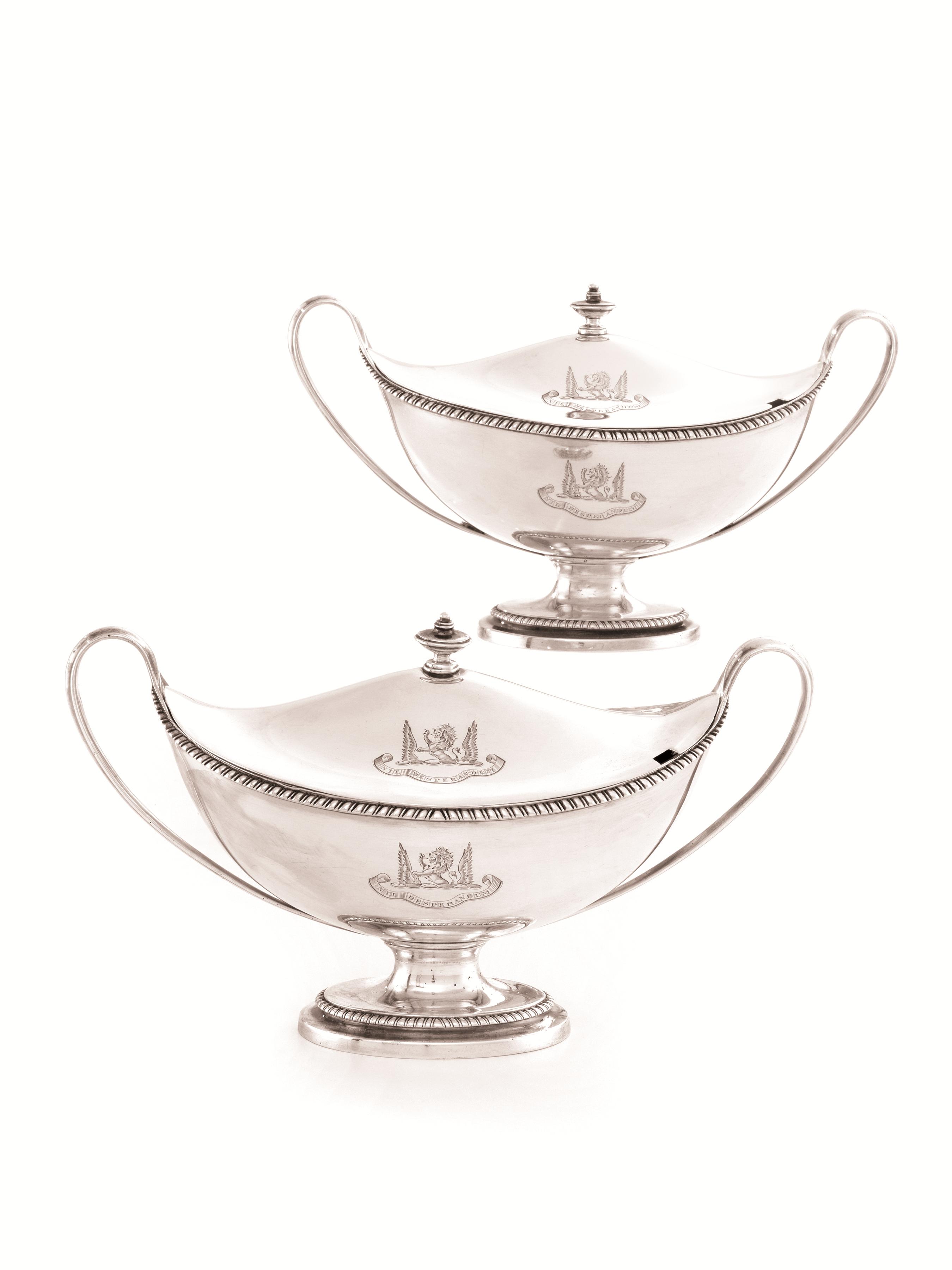 di forma a navette, corpo e coperchi decorati da stemma nobiliare inciso con cartiglio iscritto NIL DESPERANDUM, anse a volute, cm 25,5x12,5, complessivi g 1390 (2)