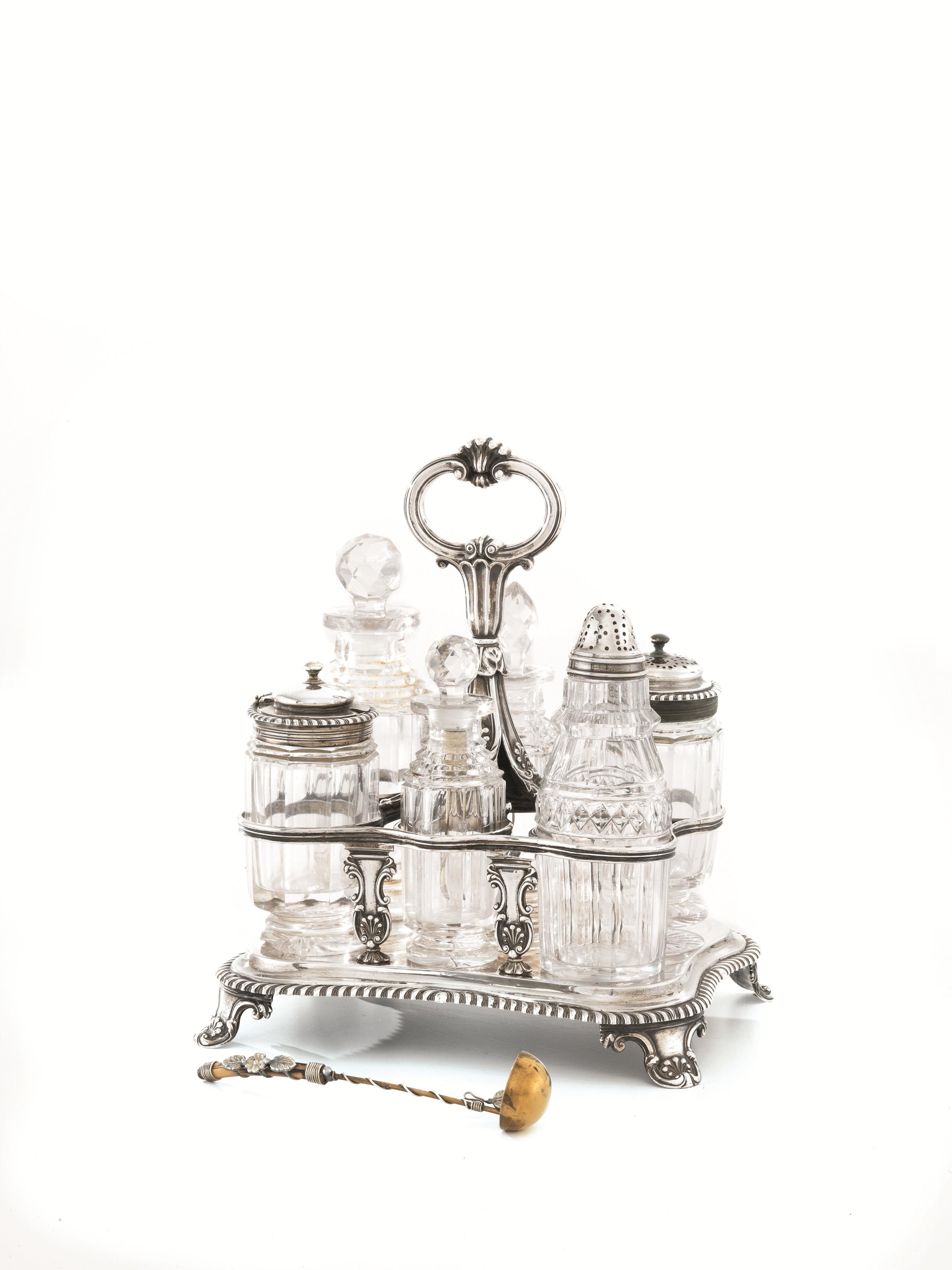 base quadrangolare sagomata con bordo a baccellature, porta ampolle a sei alloggi, fusto centrale sagomato, presa a doppia voluta, alt. cm 25, g 600