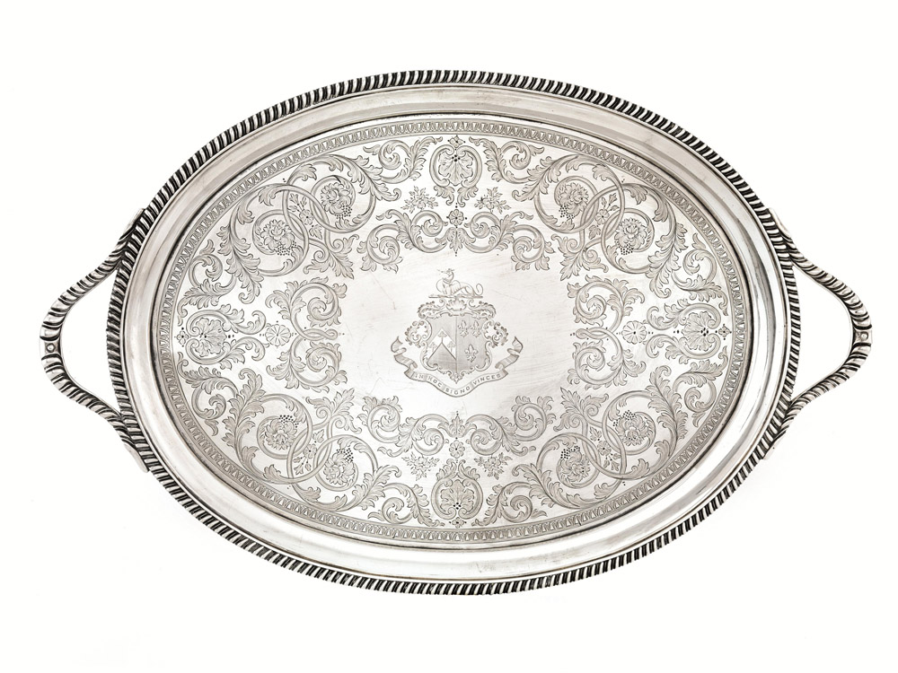di forma ovale, piano inciso a volute di foglie, al centro stemma con cartiglio iscritto in hoc signo vinces, cm 62, g 2465