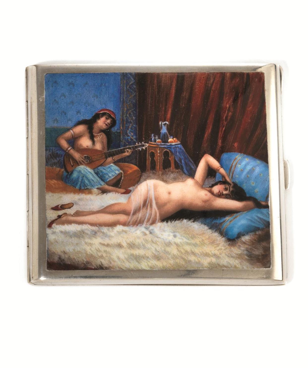 in metallo argentato, all'interno decorazione a smalto raffigurante figura femminile in ambiente medioorientale, cm 9x7,9