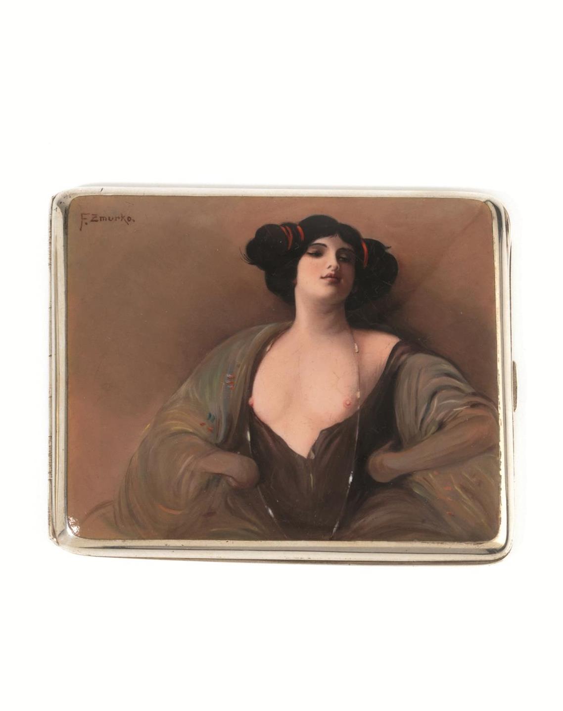 in argento, coperchio decorato a smalto con "Ritratto di Weranda" di Franciszek Zmurko, cm 9,5x8, g 150