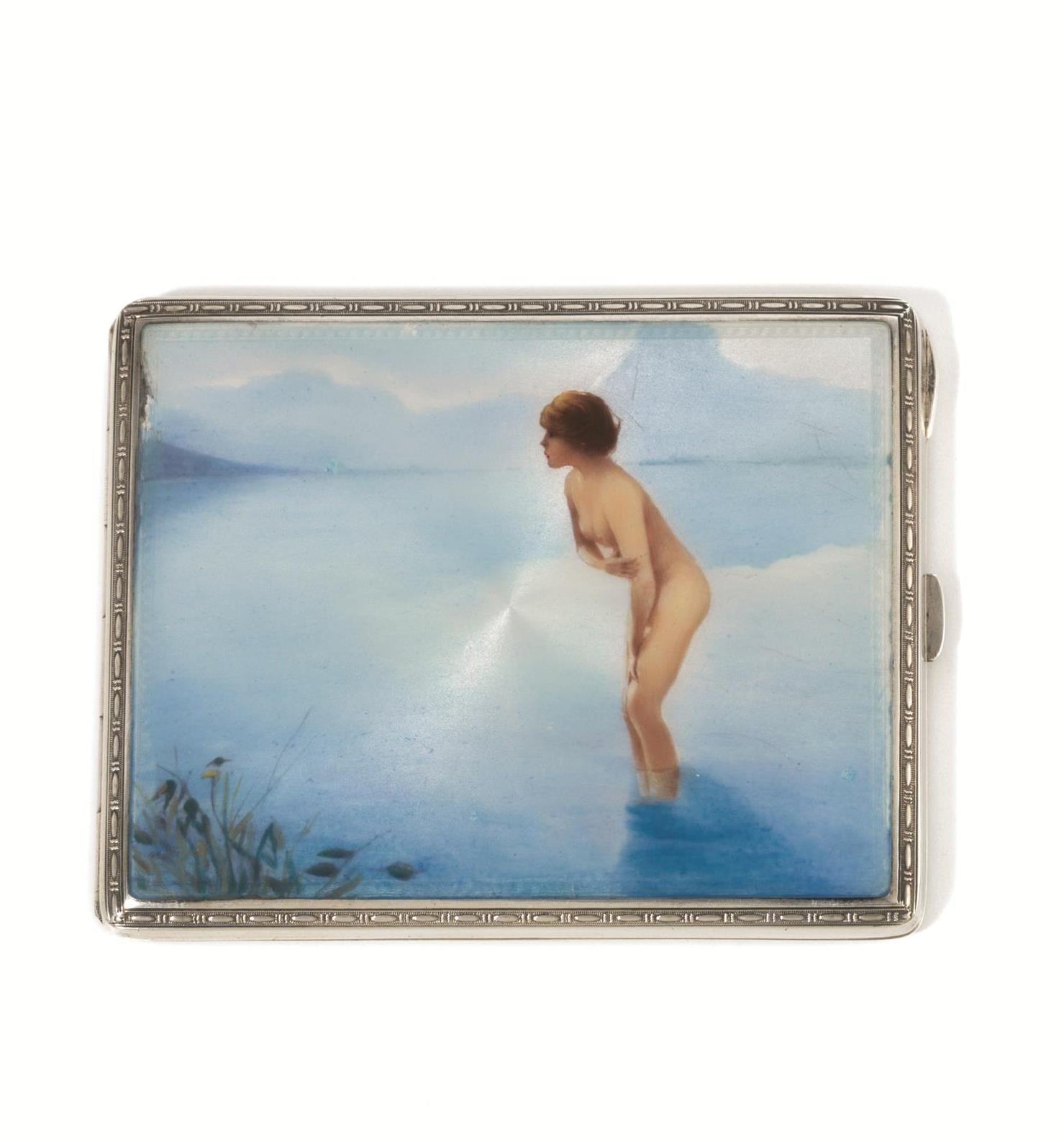 in argento 935, di forma rettangolare con coperchio decorato a smalto da bagnante entro paesaggio lacustre, cm 10x8, g 155