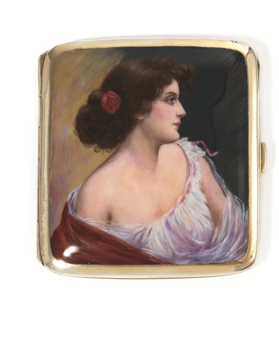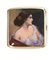 in metallo argentato, coperchio decorato in smalto con figura femminile, cm 8x8,5