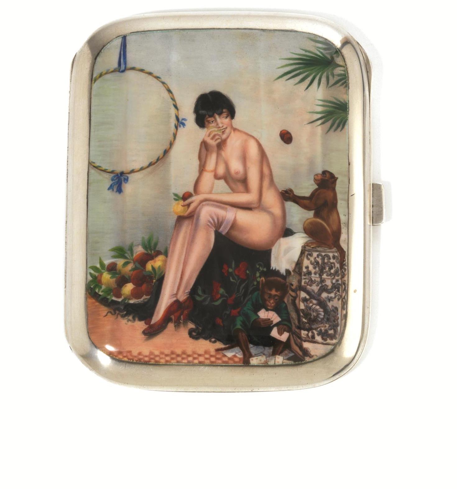 in argento, coperchio decorato a smalto con nudo femminile con scimmie, cm 8x10,2, g 165