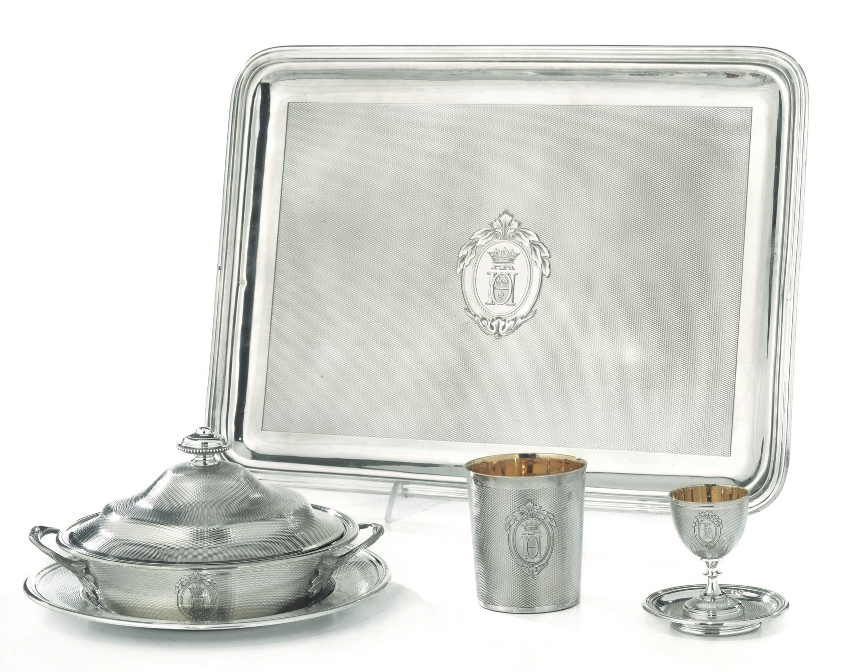 lavorato guilloché e decorato da stemma di Henry D'Orleans, interni in vermeil, composto di vassoio, bicchiere, porta uovo, e piccola zuppiera con vassoio e coperchio, g 2416 (5)