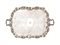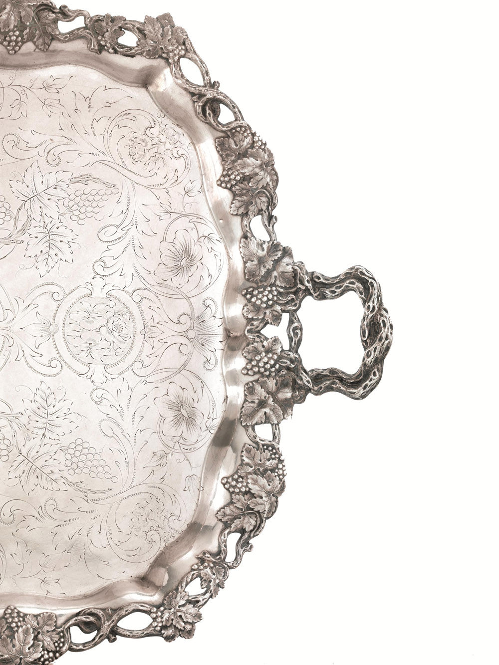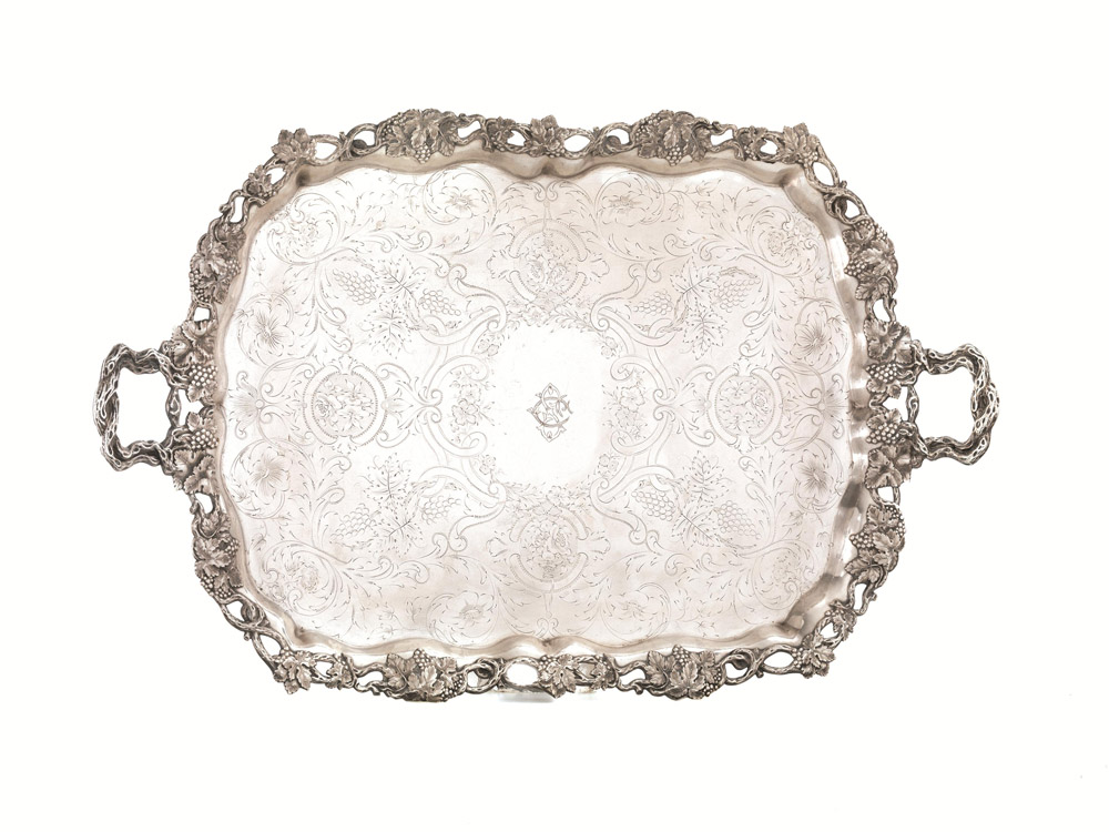 di forma rettangolare con bordo sagomato, traforato e sbalzato a tralci di vite, due anse realizzate come racemi d'uva, piano inciso con monogramma al centro, cm 89x54, g 4610