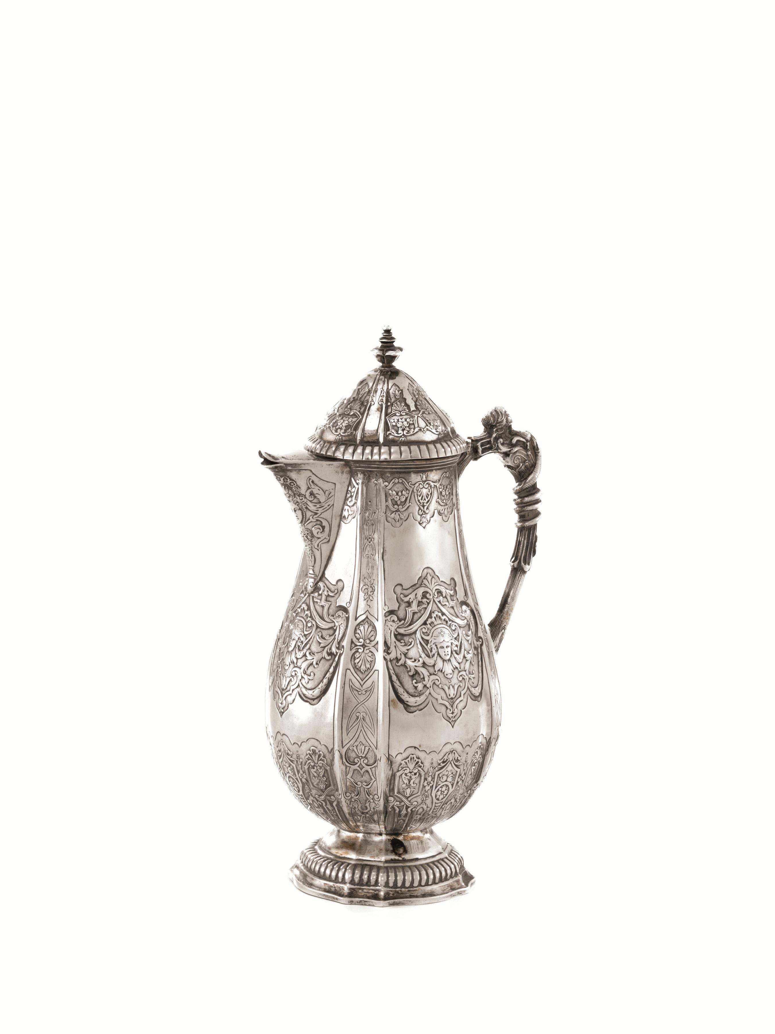 corpo riccamente decorato a volute e motivi vegetali, manico terminante a figura femminile, alt. cm 29 , g 930