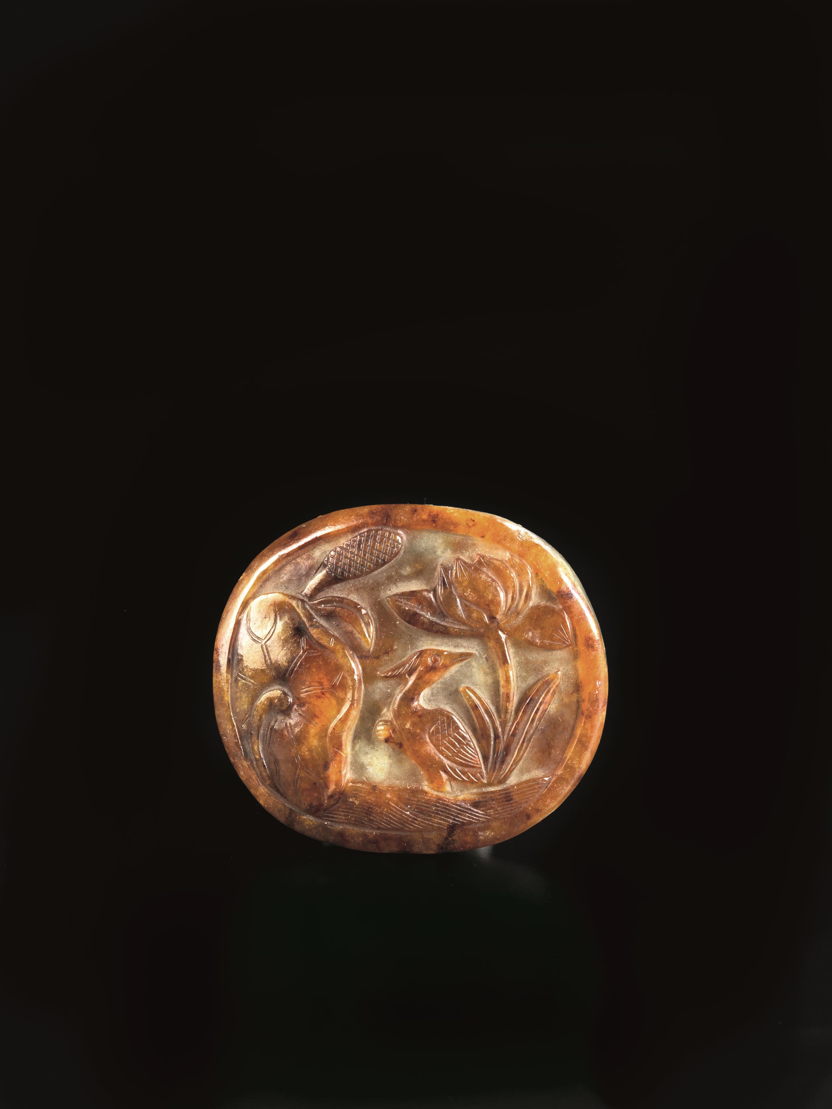 in giadeite russet, decorata con un volatile tra fiori di loto lung. cm