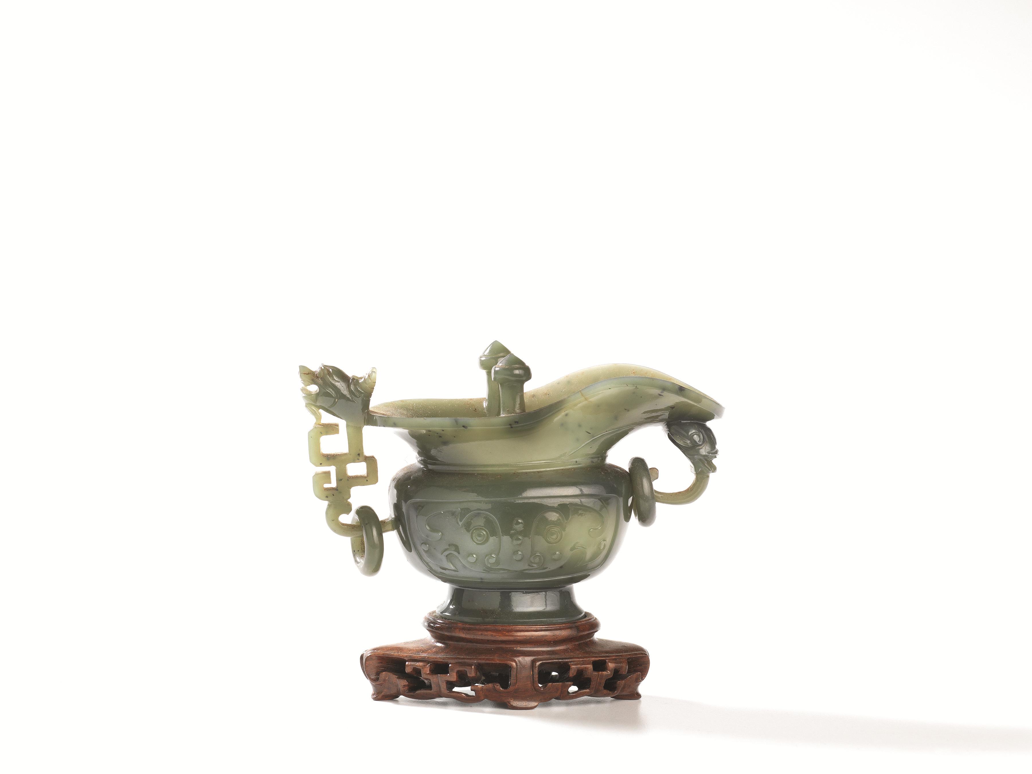 PICCOLO VERSATOIO, CINA, SEC. XXin giada verde spinacio, decorato con motivo...