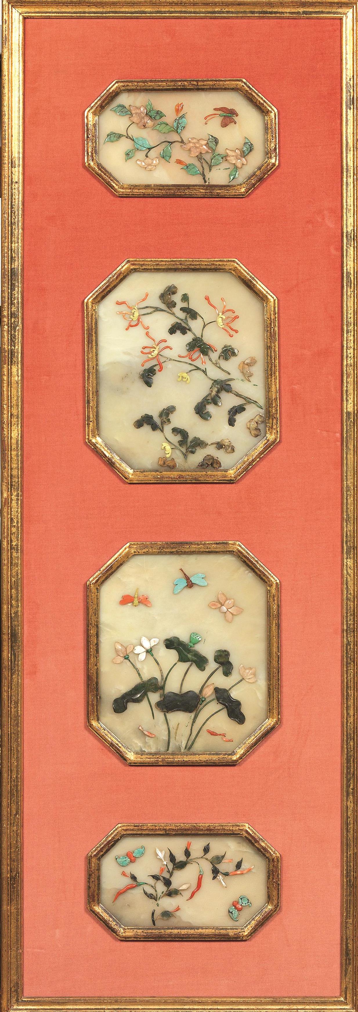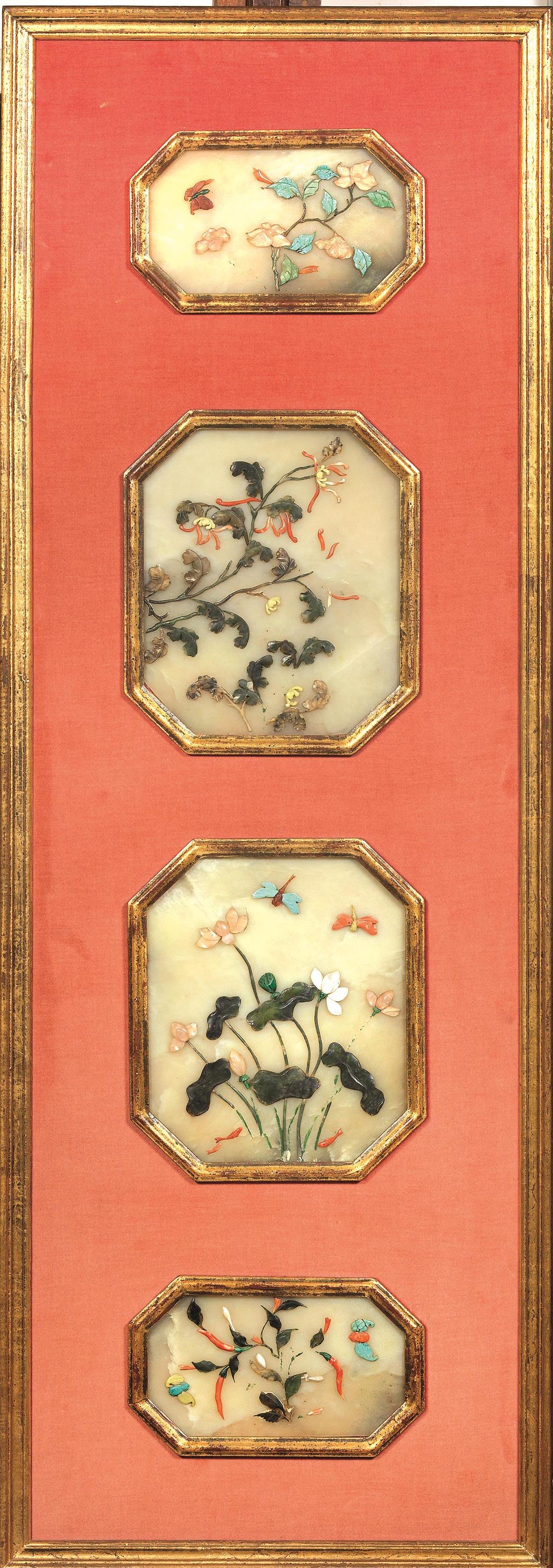 DUE PANNELLI CINA SEC. XIX il legno montati con placche in petra dura...
