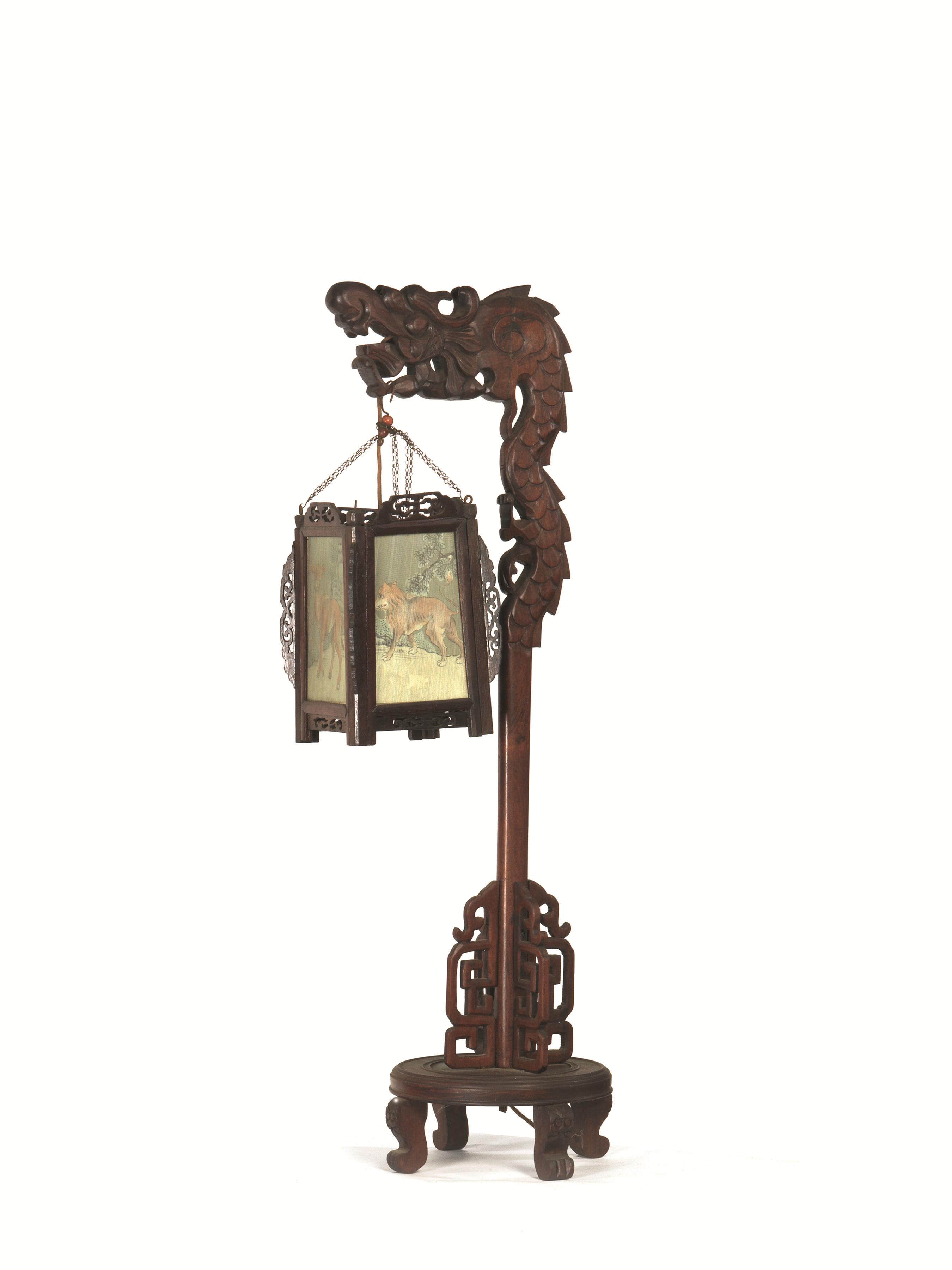 cm 90 e una lanterna con pannelli dipinti su stoffa con motivi di personaggi, diam cm 94, h. cm 90 (3)