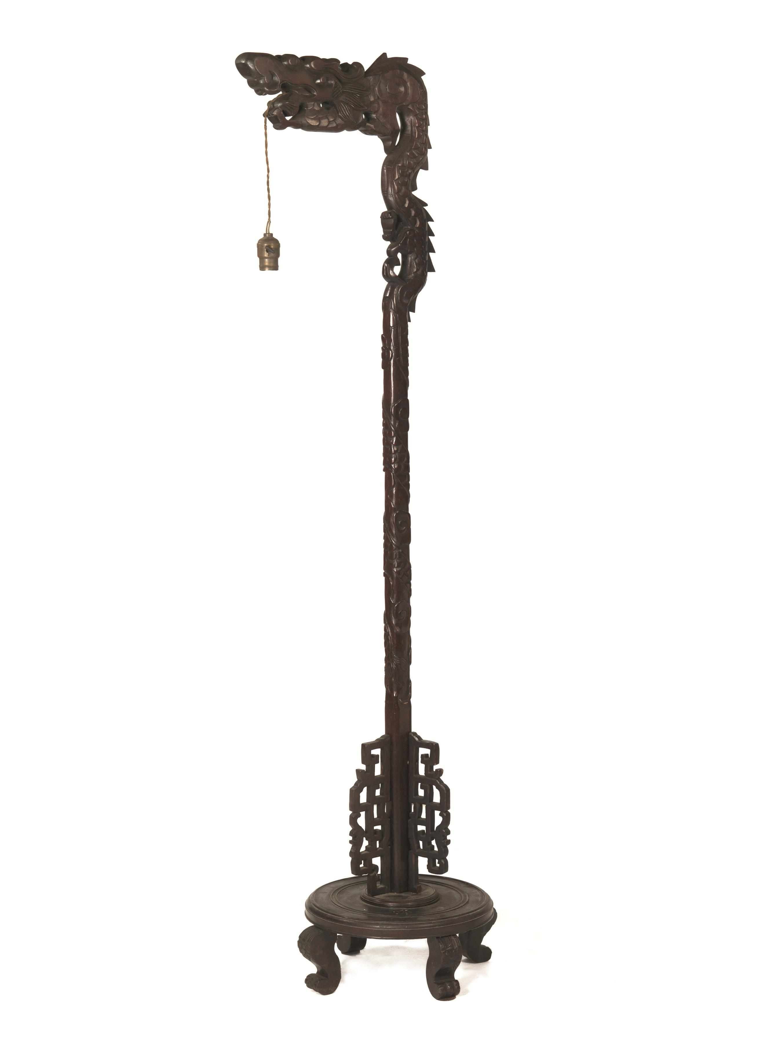due in legno duro modellate nella sommità con testa di drago, alt. cm 180 alt.