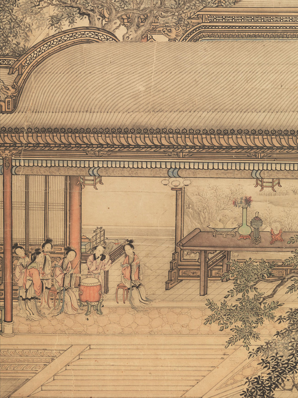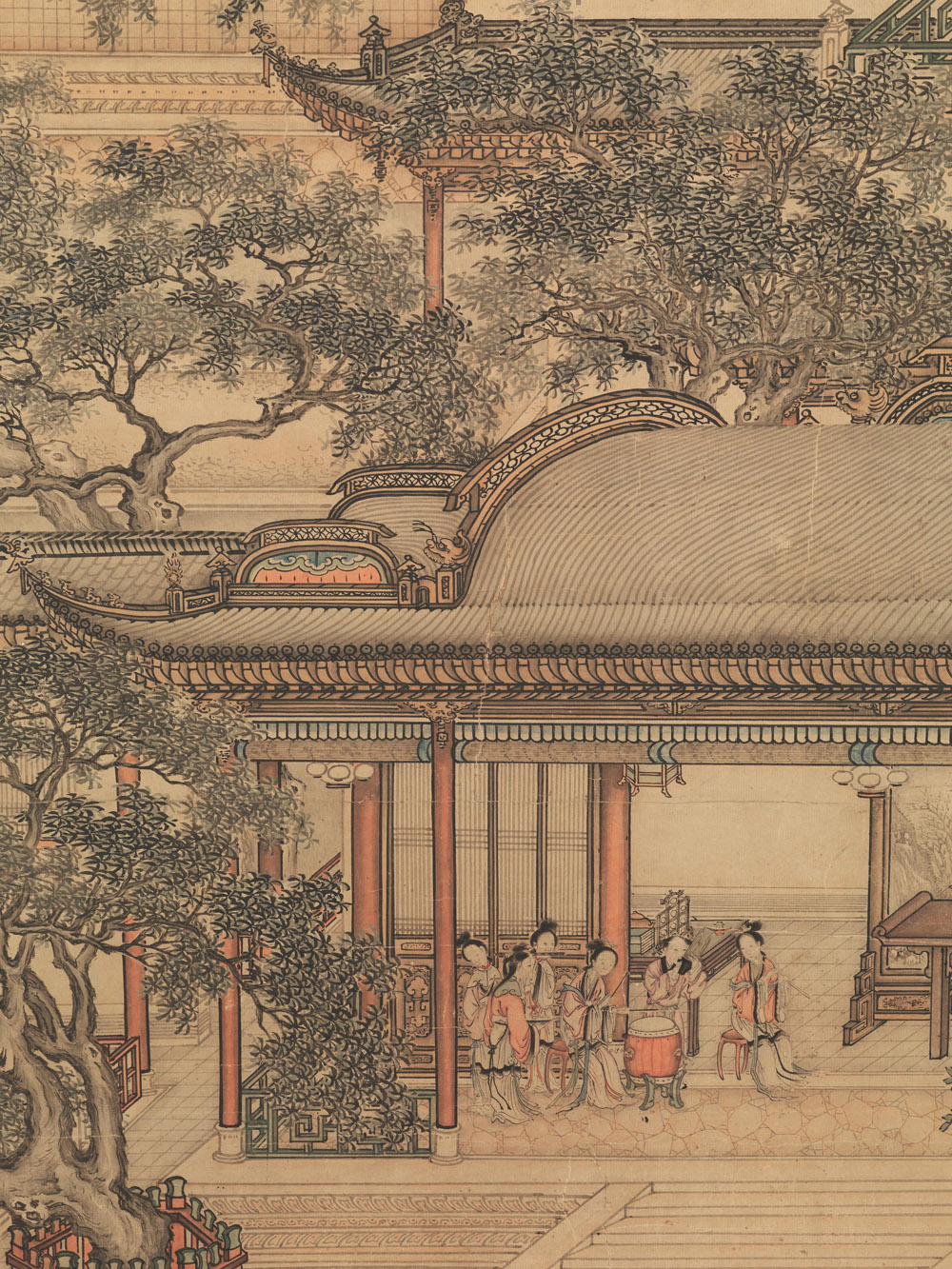DIPINTO CINA su carta riportata su tela raffigurante palazzo in un...