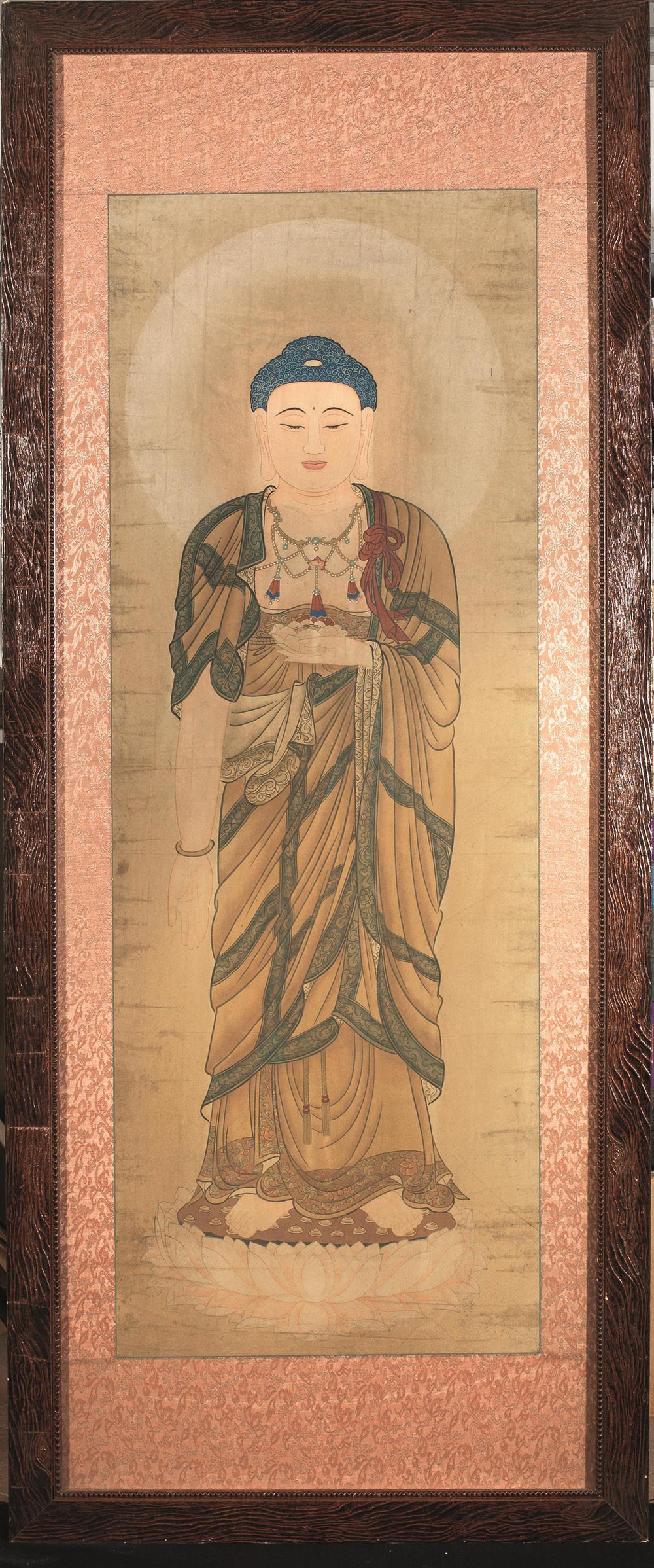 su carta raffigurante Buddha stante, reggente tra le mani un fior di loto