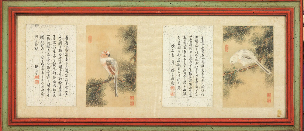 su carta raffiguranti due decorati con volatili e due decorati con poesie,