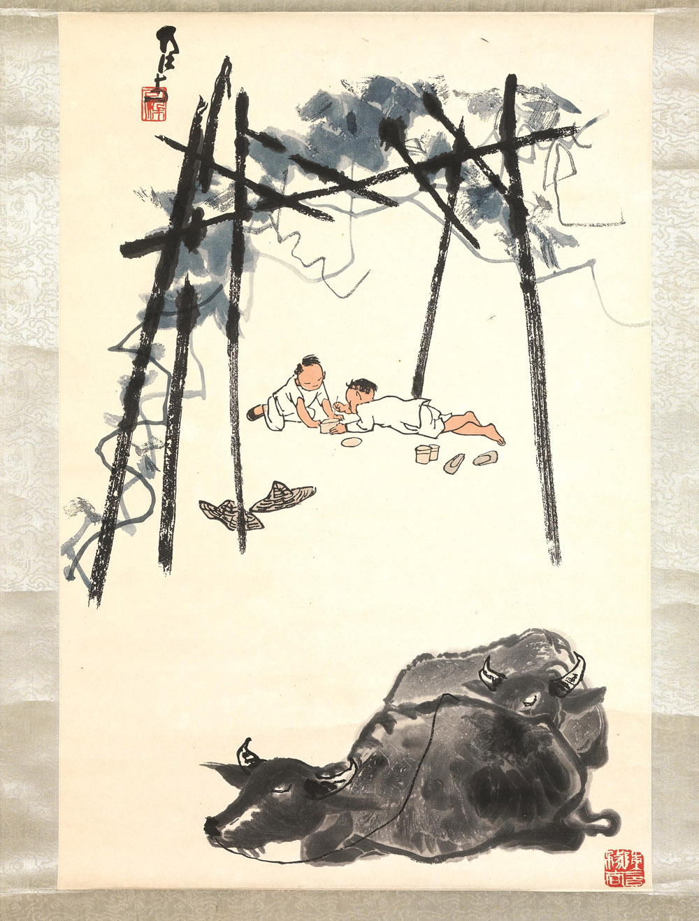 pittura e inchiostro su carta, raffigurante bambini e bufalo, cm 68x45,5, firmato Li Keran (1907-1989)