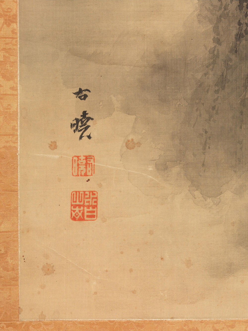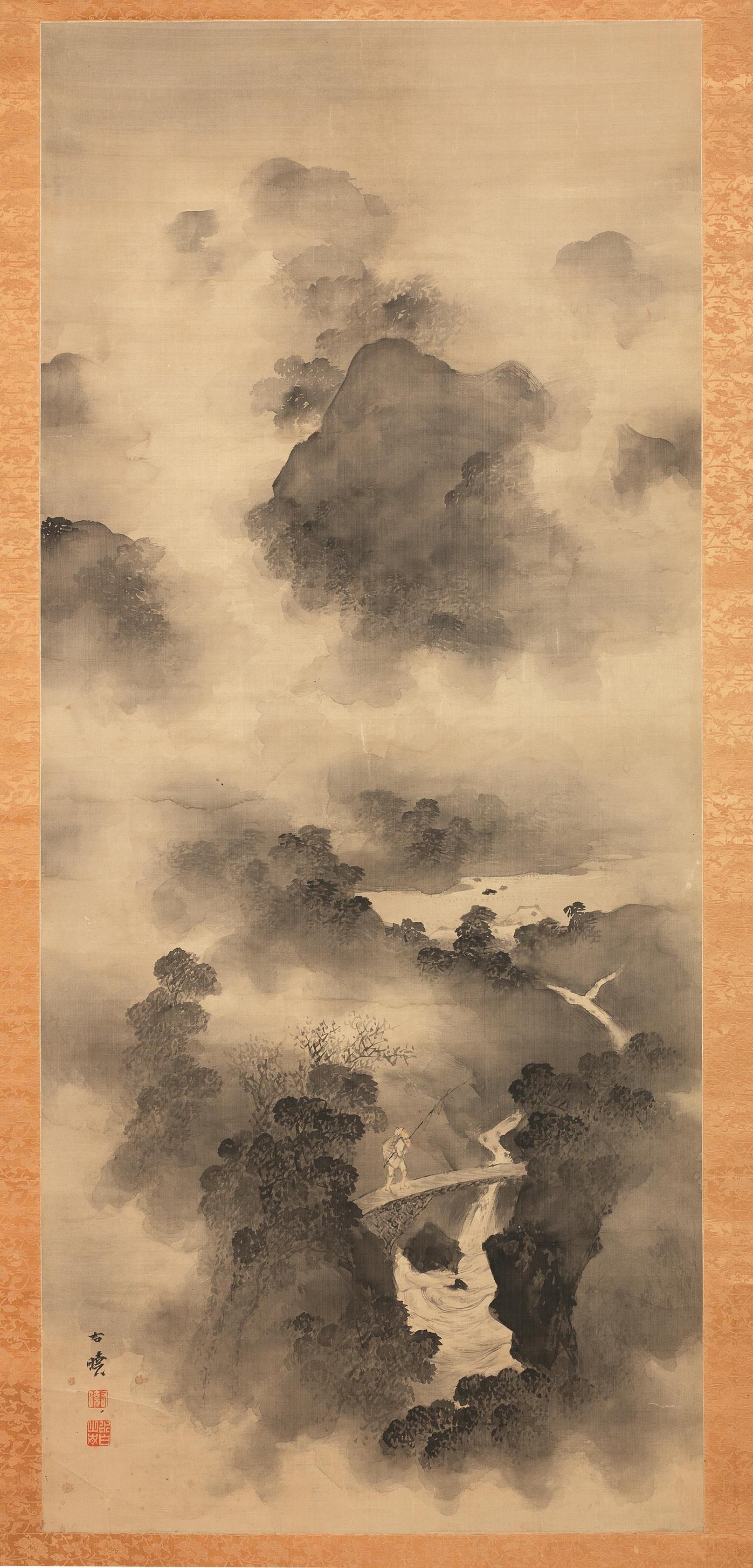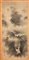 dipinto su seta raffigurante paesaggio fluviale con figura che attraversa