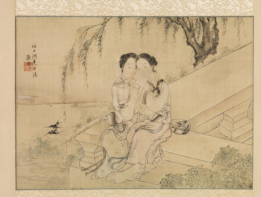 A SILK PAINTING MOUNTED ON PAPER, WITH TWO LADIES IN A GARDEN, CHINA,