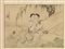 su seta riportata su carta, raffigurante due figure femminili sedute su una panchina in un giardino, cm 29x39