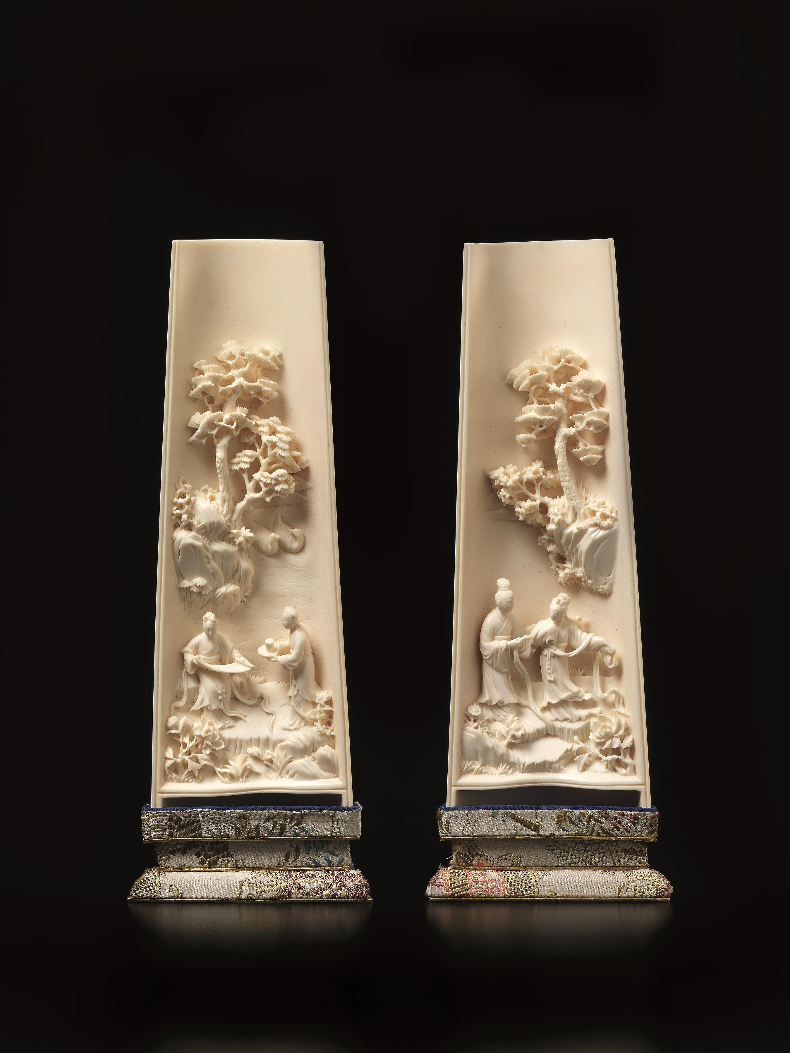 Lotto 100 | DUE POGGIAPOLSI CINA SEC. XIX in avorio finemente decorati con figure...