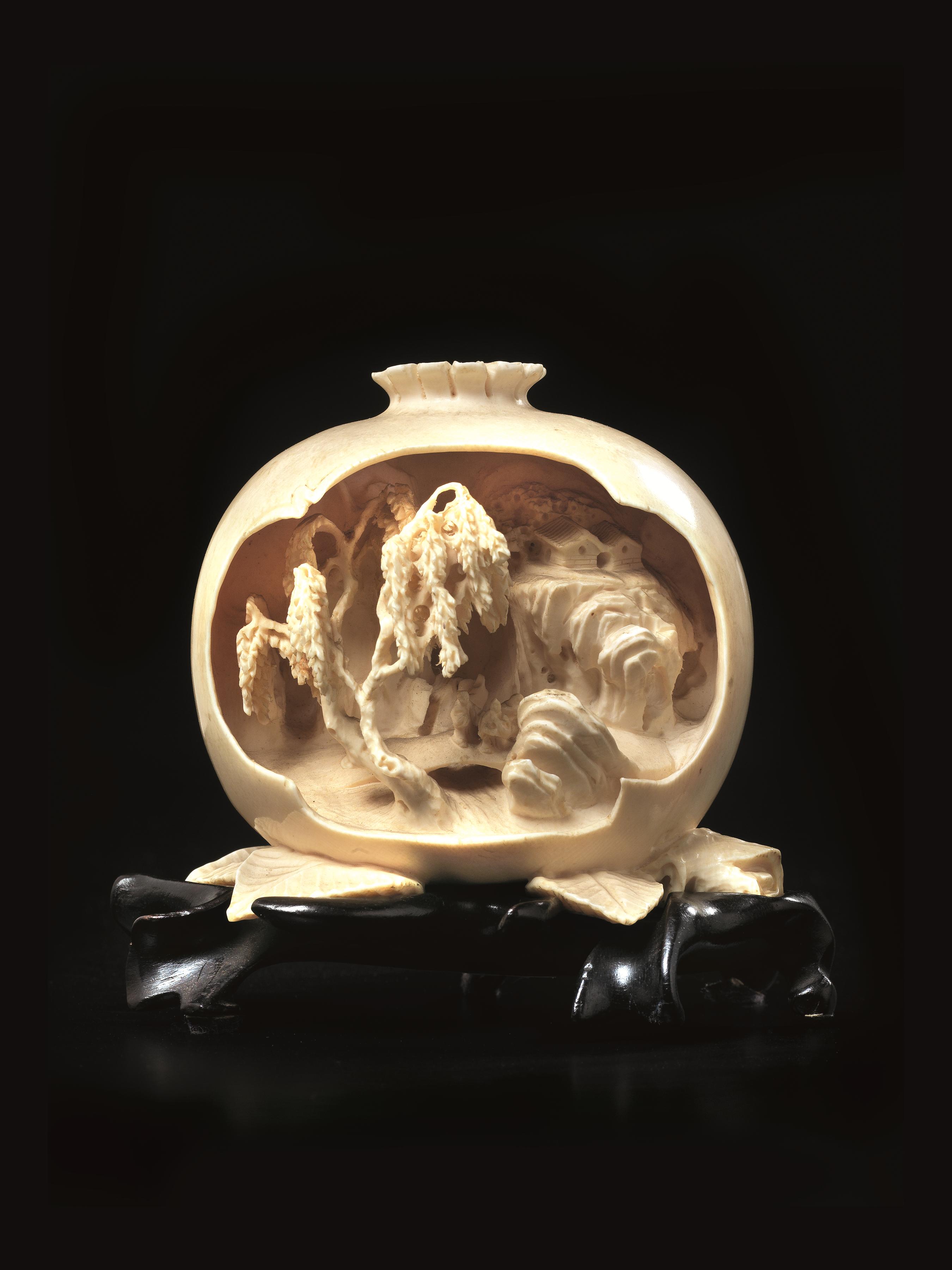 in avorio modellato nella forma di melograno all'interno decorato con figure in un paesaggio, alt. cm 9, poggiante su base in legno