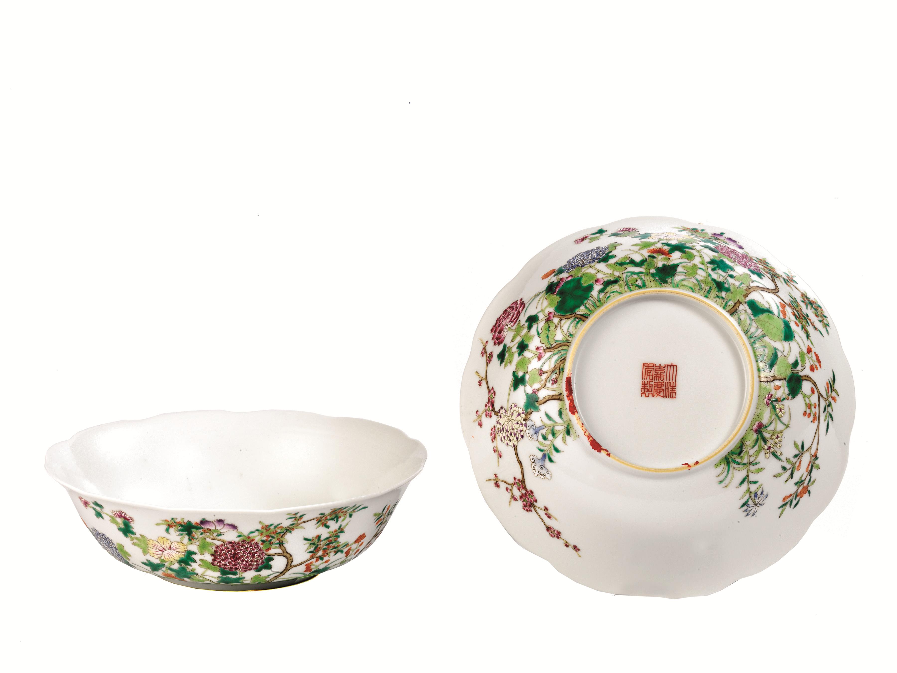 in porcellana policroma decorati all'esterno con peonie, recanti marchio Jiaqing,  diam cm 20 (2)