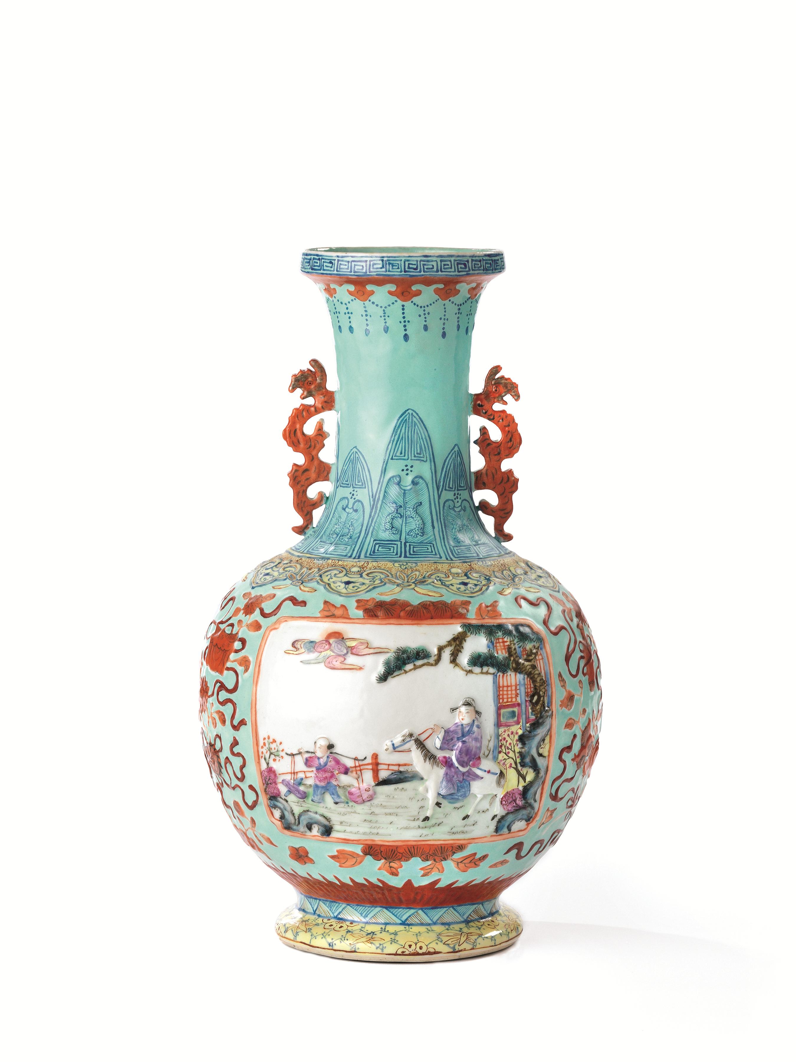 in porcellana policroma , forma di bottiglia, decorato con motivi floreali a rilievo su fondo turchese e con due riserve con personaggi, le anse con due manici a forma di Qilin stilizzati alt. cm 35