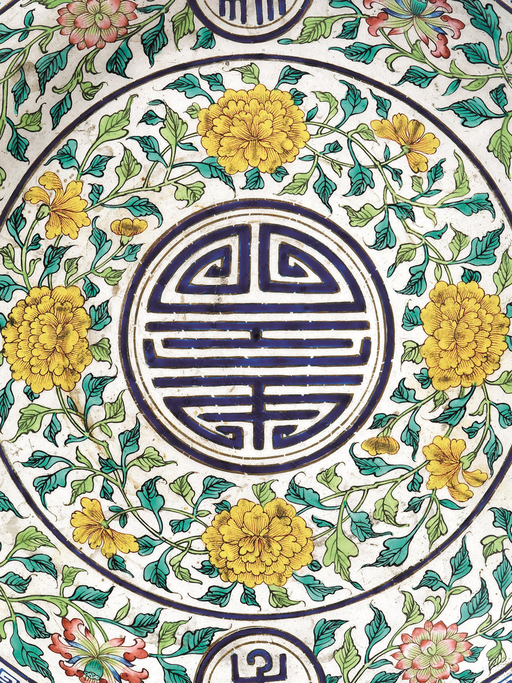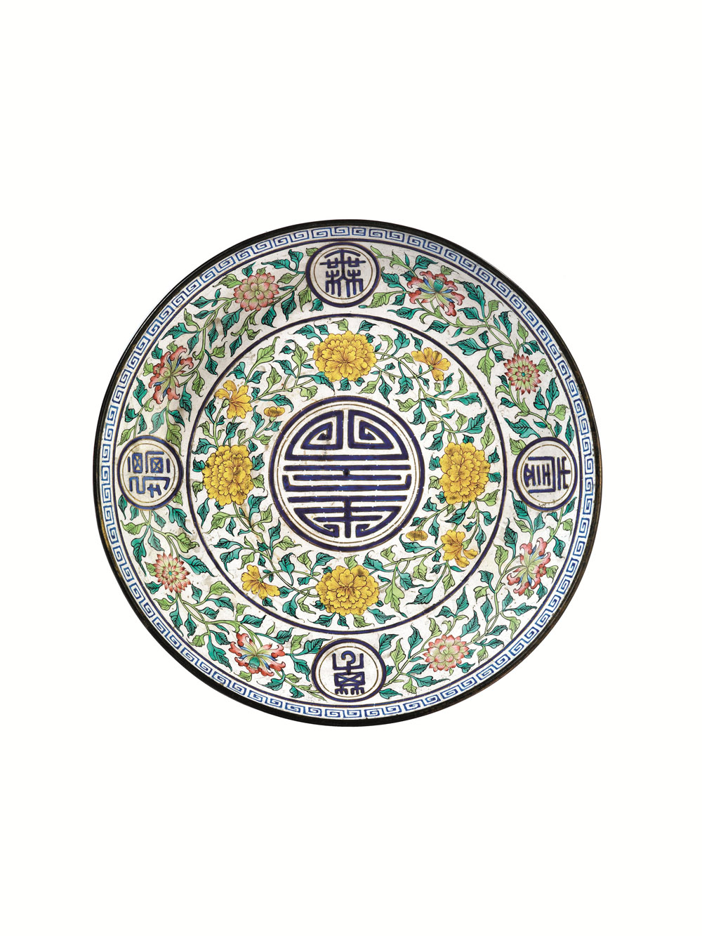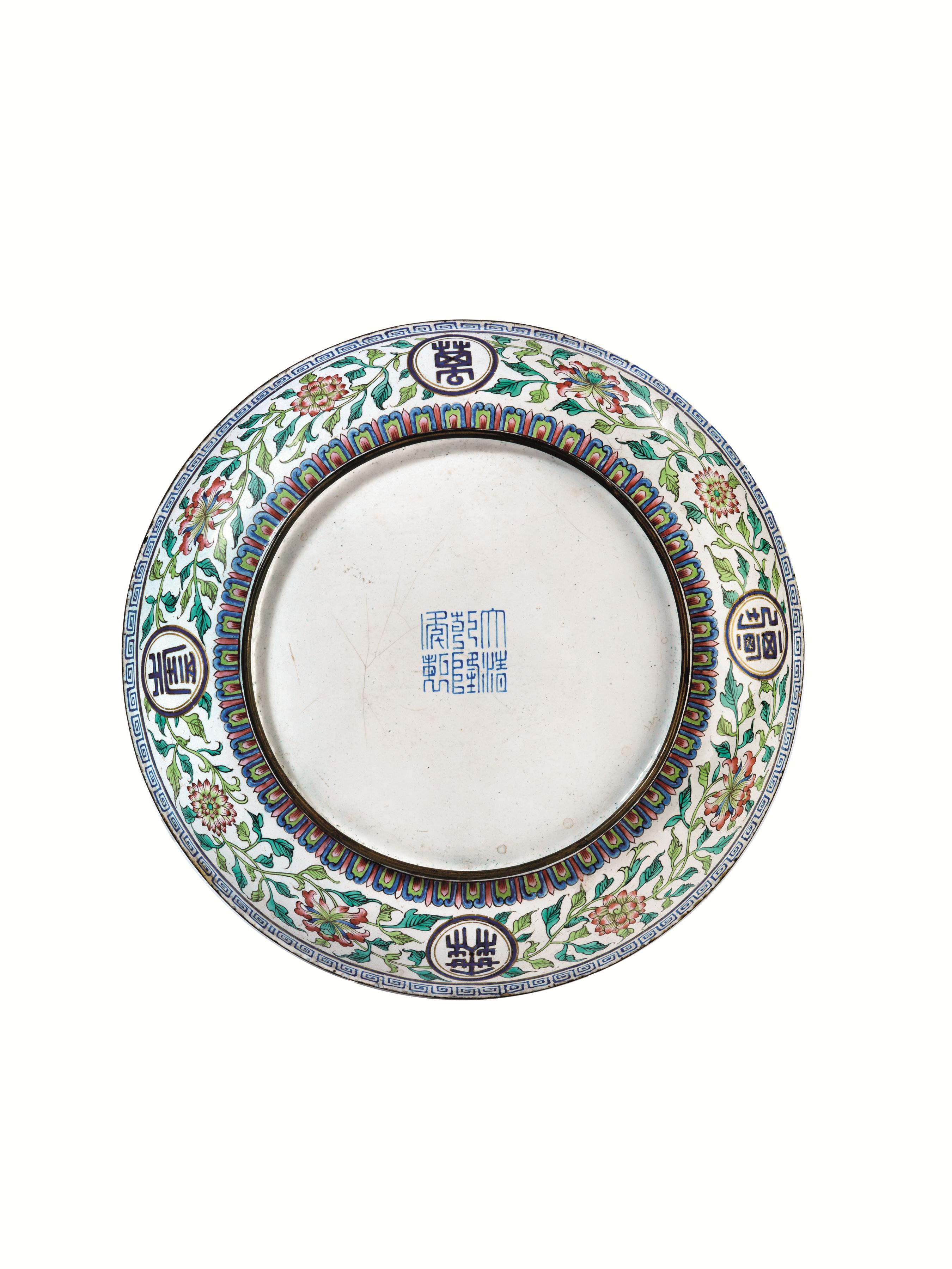 A LOTUS AND SHOU CARACTER ENAMEL METAL PLATE CHINA QIALONG MARK AND OF THE PERIOD