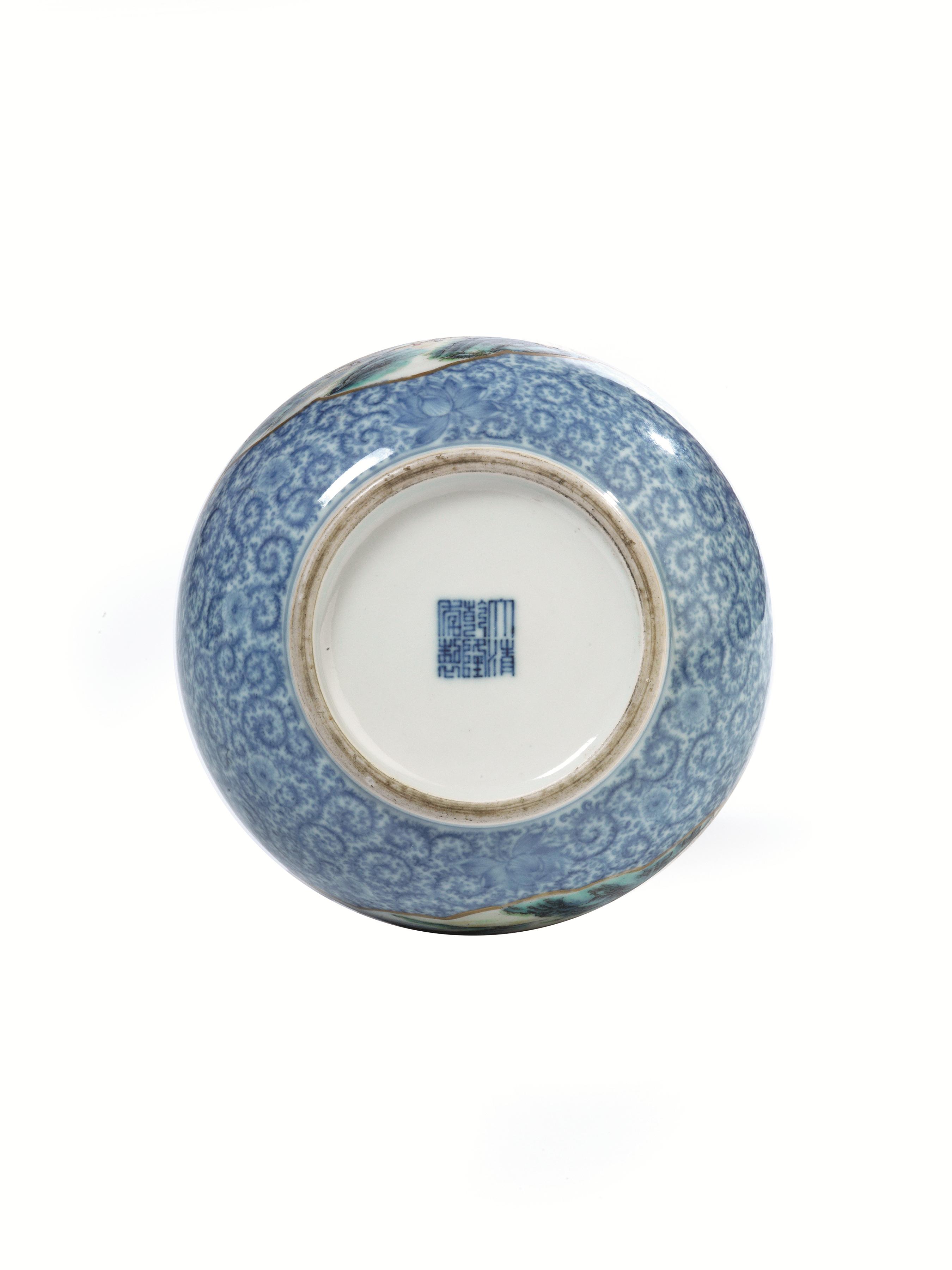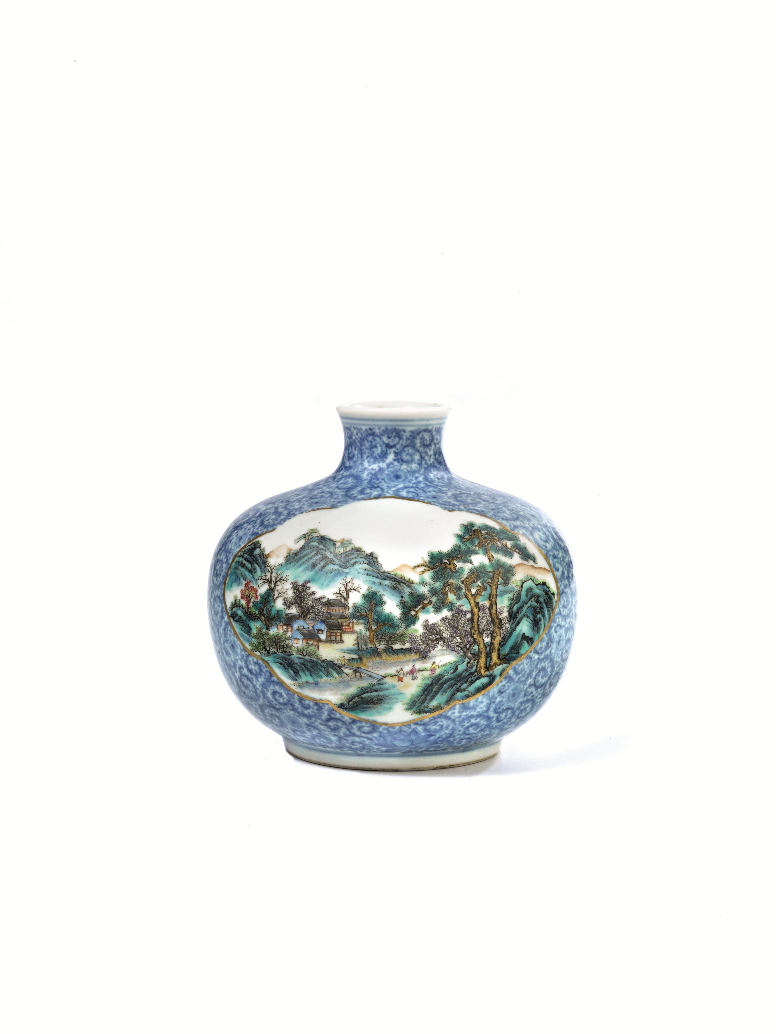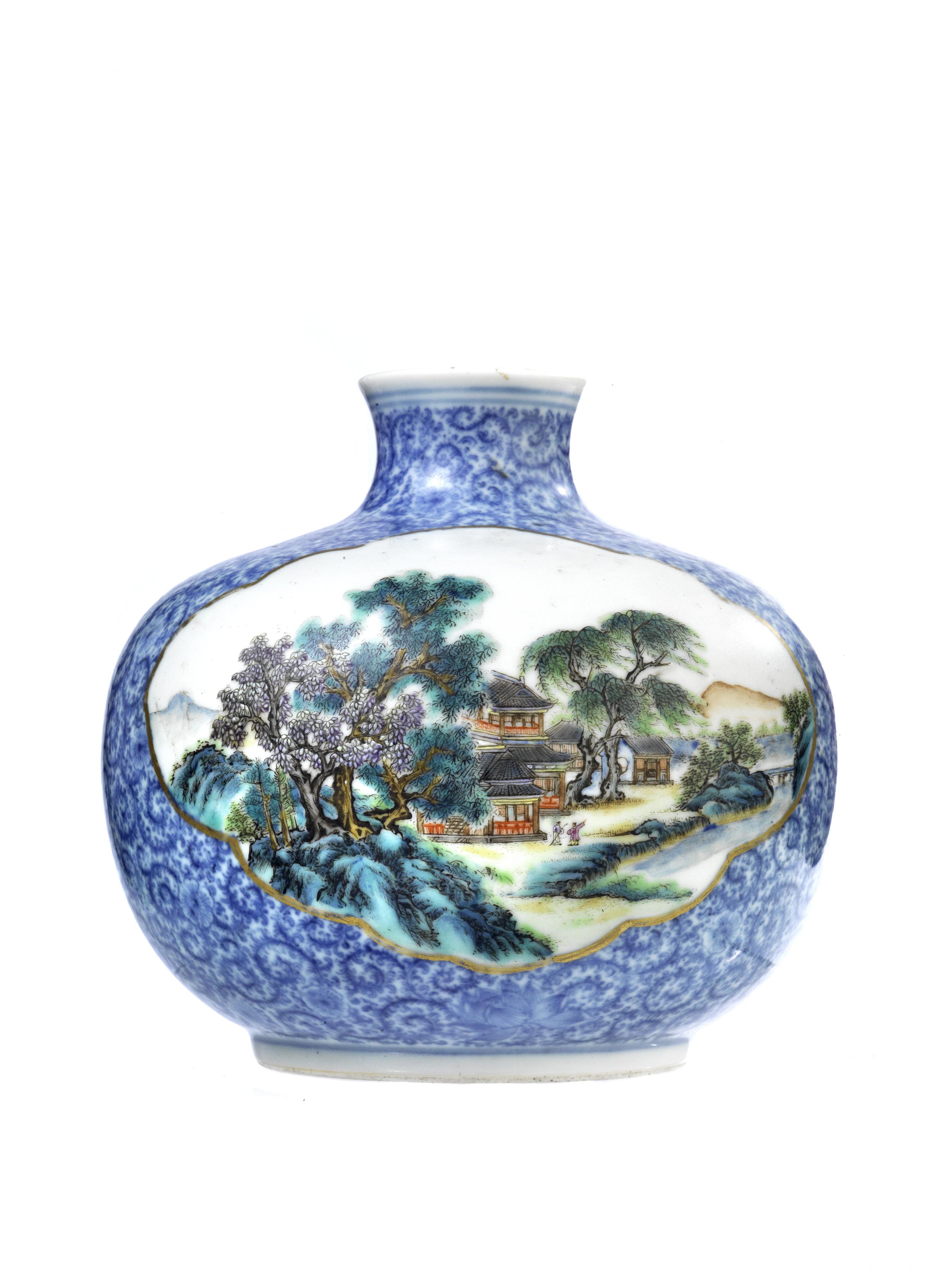 in porcellana dalla forma bombata decorato con motivi floreali sull azzurro e sul fronte e sul retro due riserve sagomate e finemente smaltate  con motivo di paesaggio, sul fondo reca marchio Qianlong