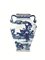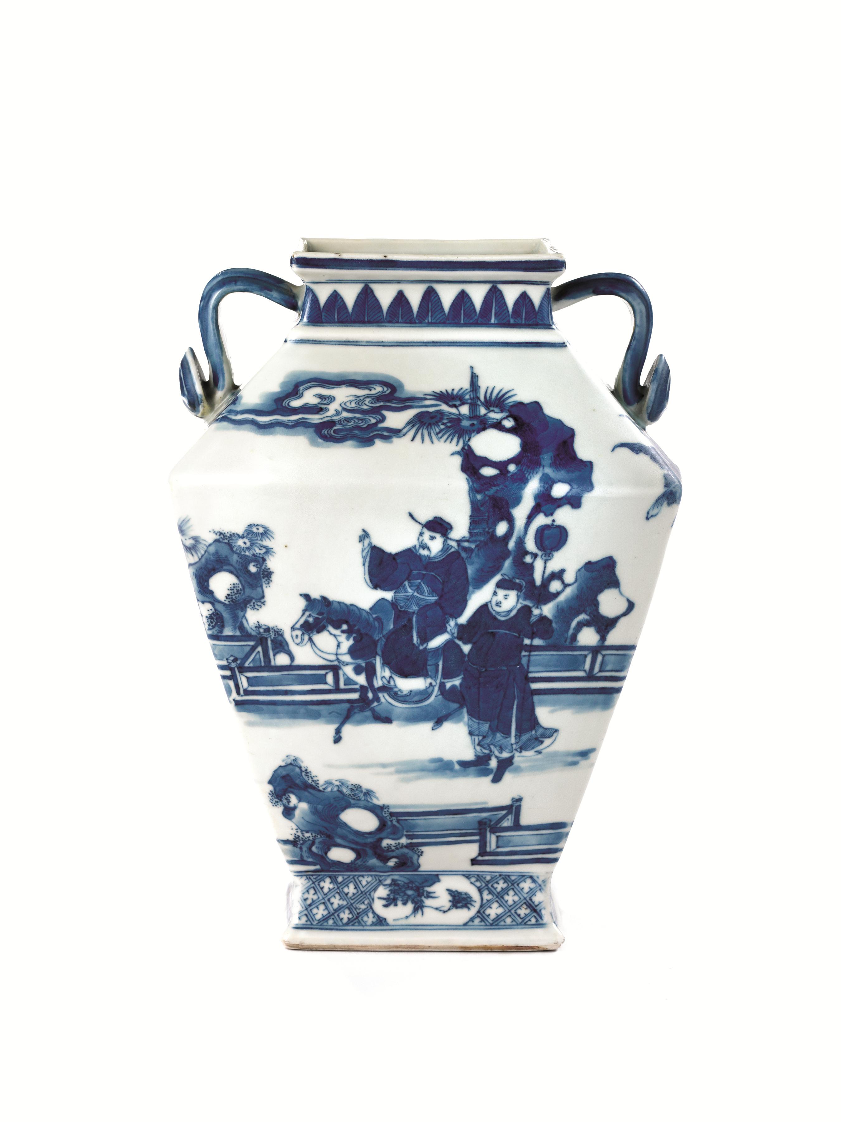 in porcellana bianca e blu decorato con personaggi in un giardino , con prese a forma di scettro